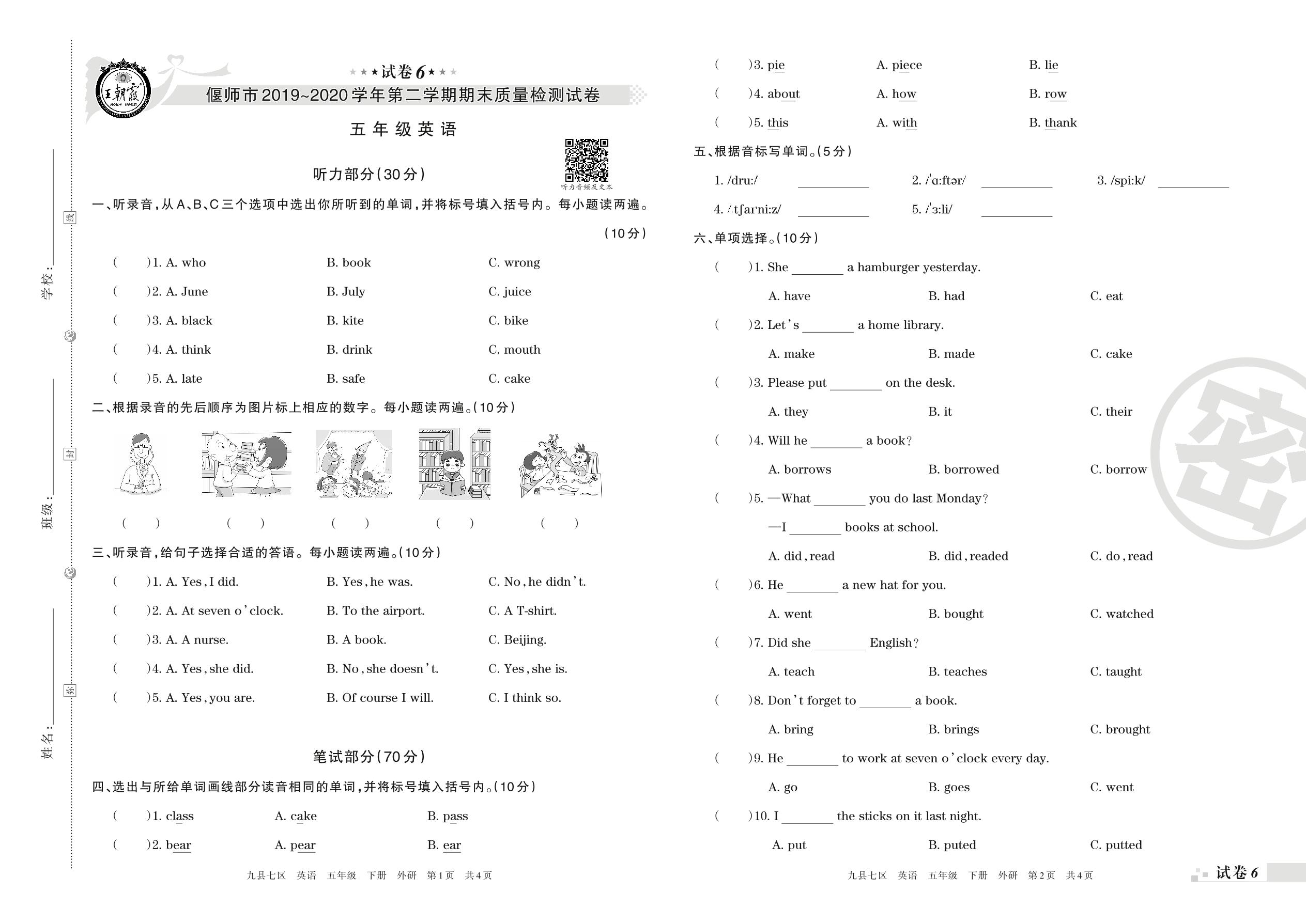 2019-2020学年第二学期偃师市五年级英语试卷(外研版)【6】