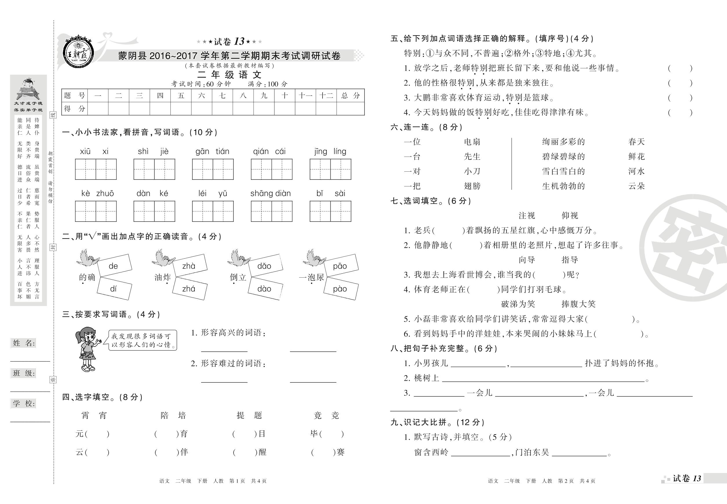 2016-2017学年第二学期临沂市蒙阴县二年级语文试卷(人教版)【13】