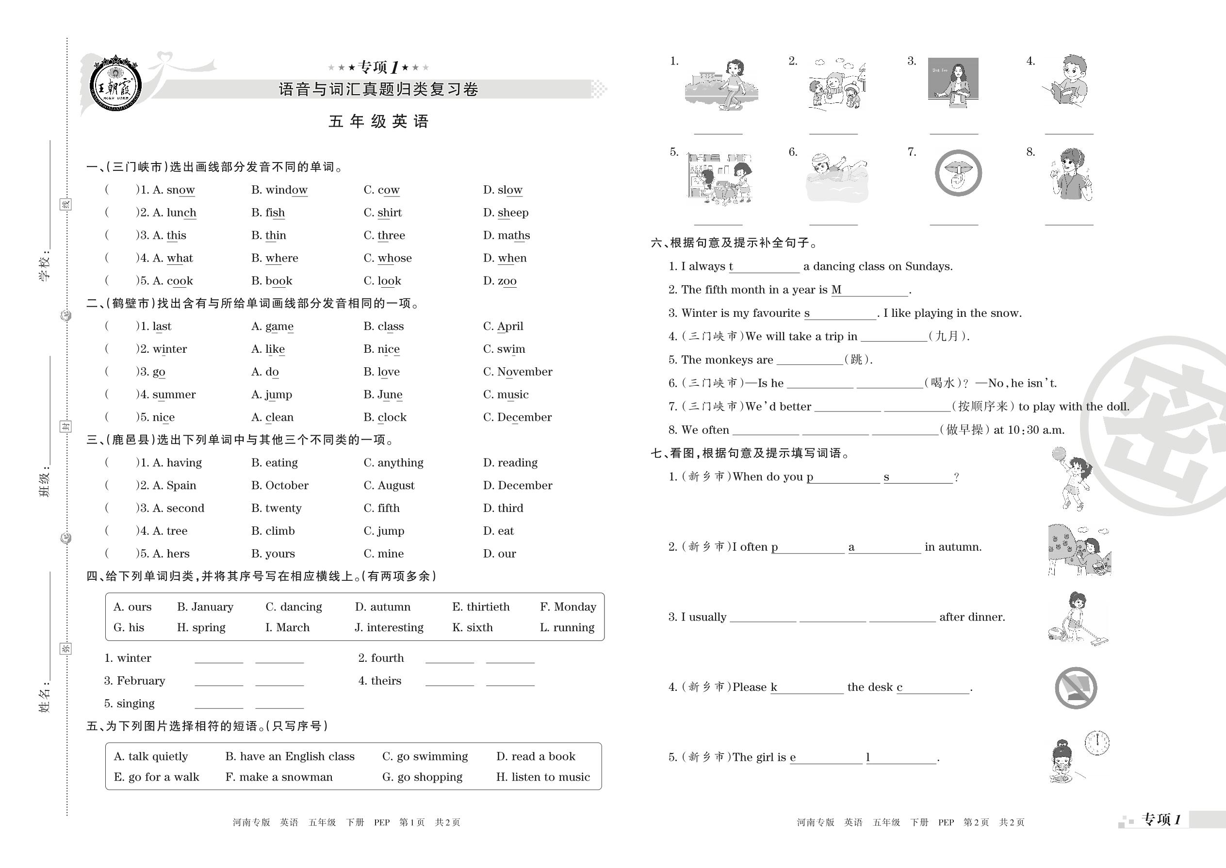 王朝霞期末专项卷——语音与词汇、句子真题归类复习五年级下册英语(PEP版)【0】