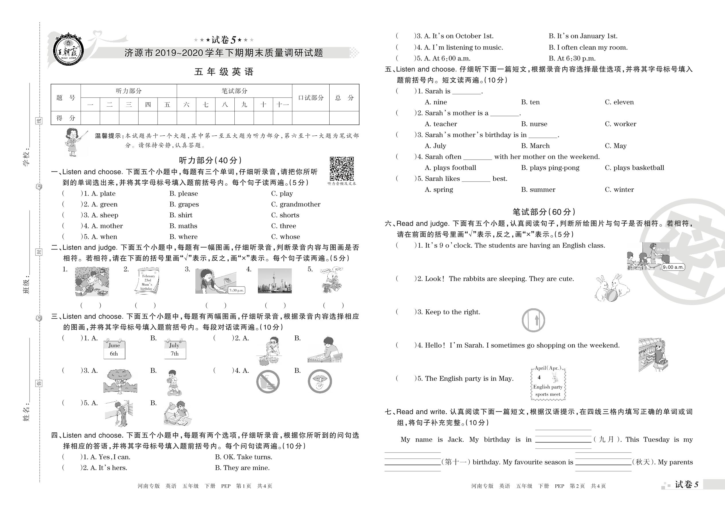 2019-2020学年第二学期济源市五年级英语试卷(PEP版)【5】