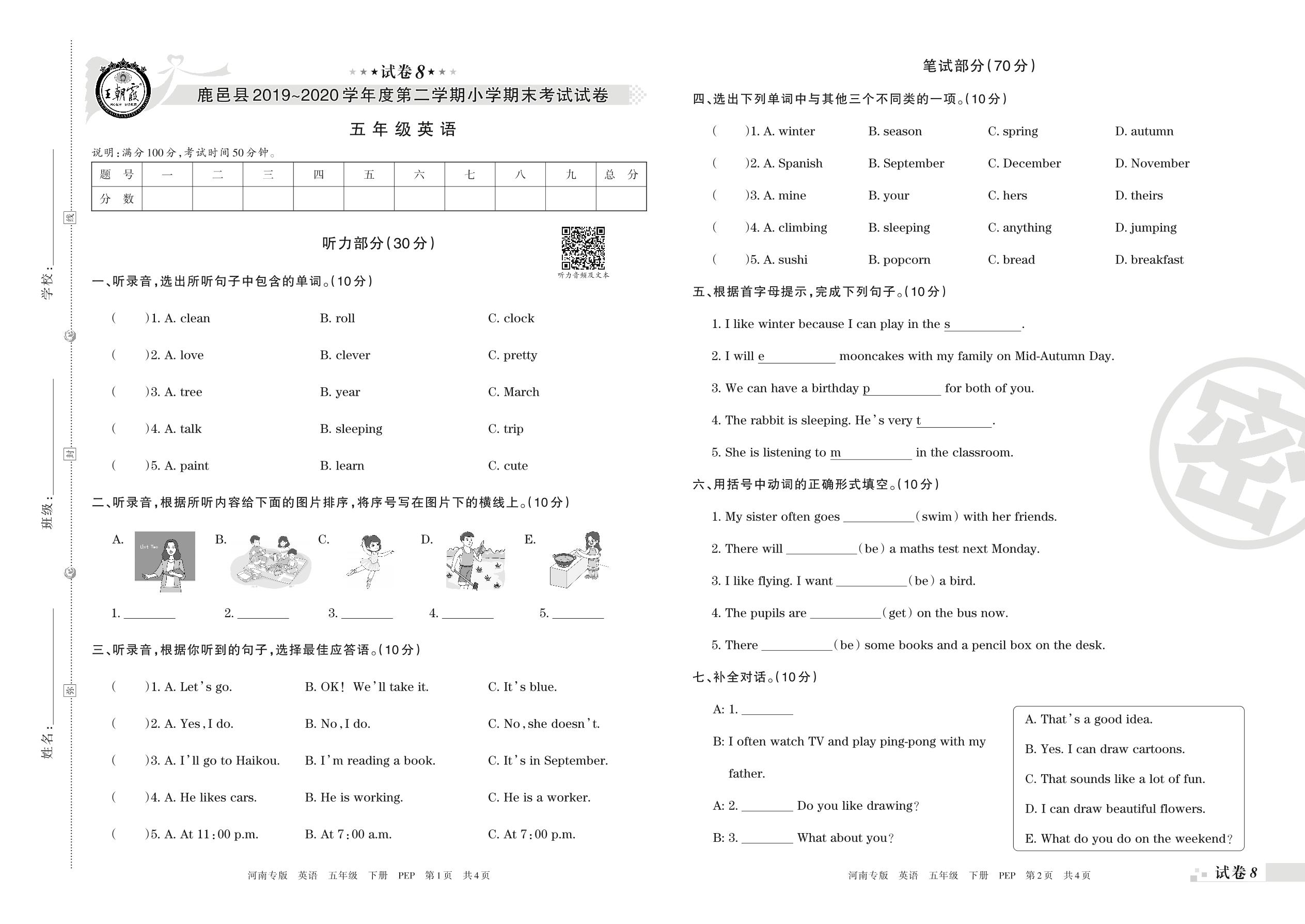 2019-2020学年第二学期周口市鹿邑县五年级英语试卷(PEP版)【8】
