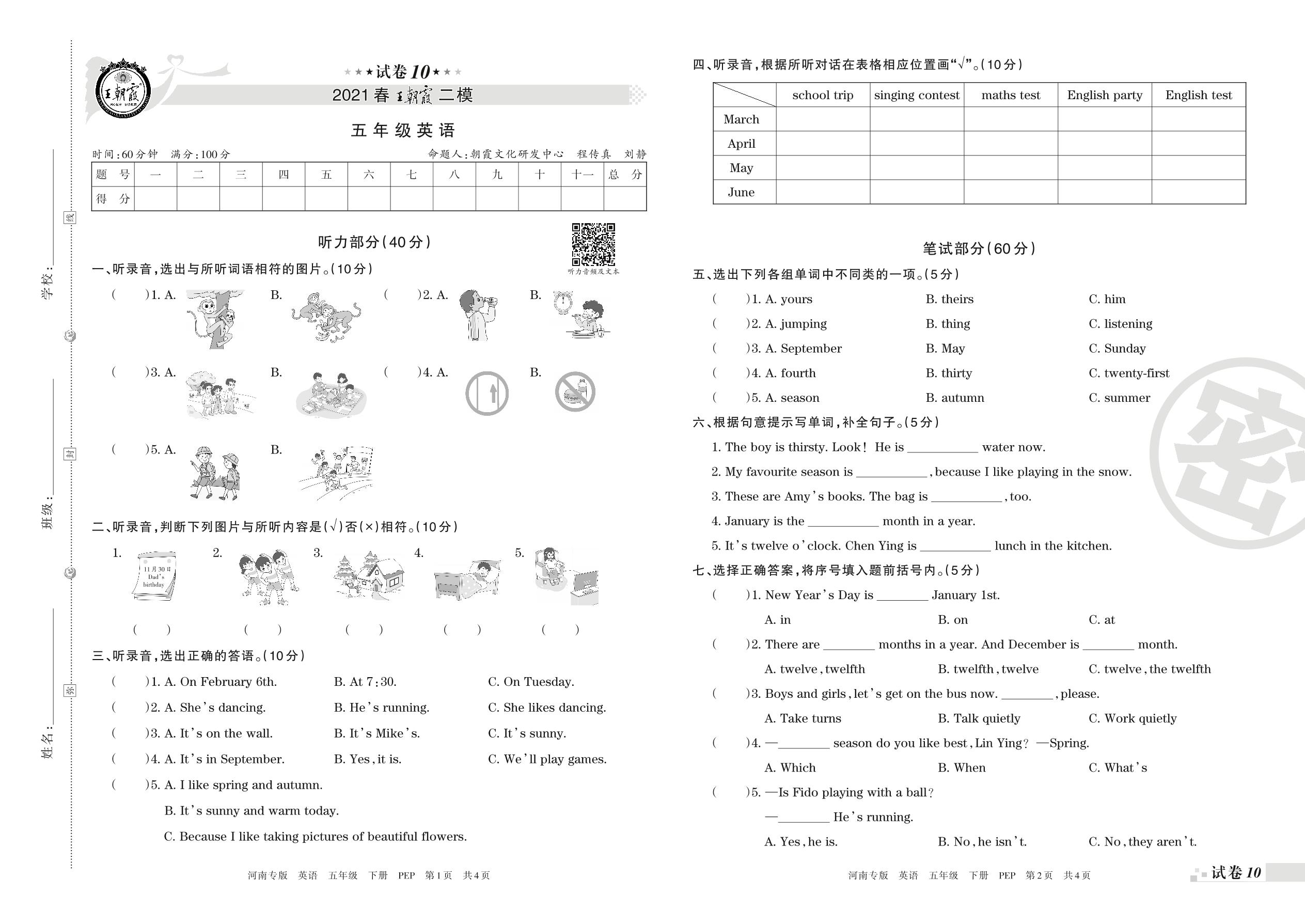 王朝霞期末模拟卷五年级下册英语(PEP版)_R210807133511【10】