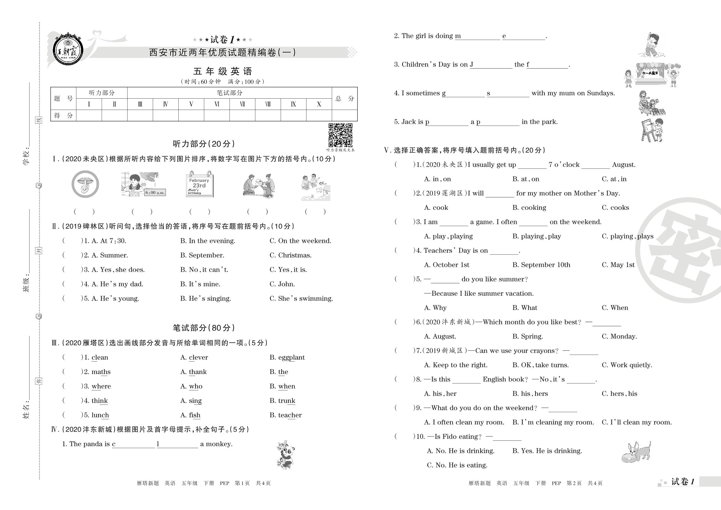 五年级英语人教PEP版(三起始)下册期末卷