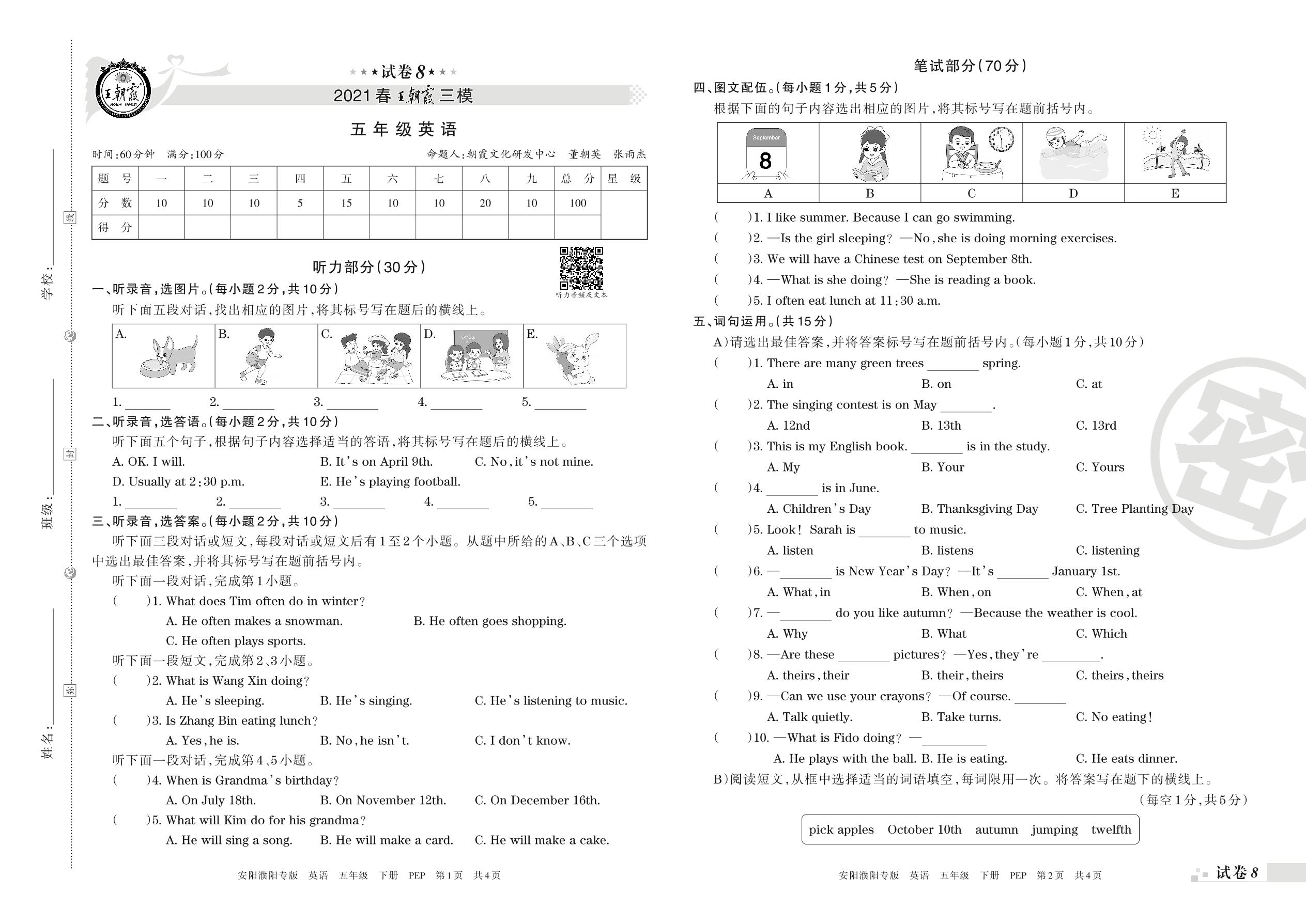 王朝霞期末模拟卷五年级下册英语(PEP版)_R210807133823【8】
