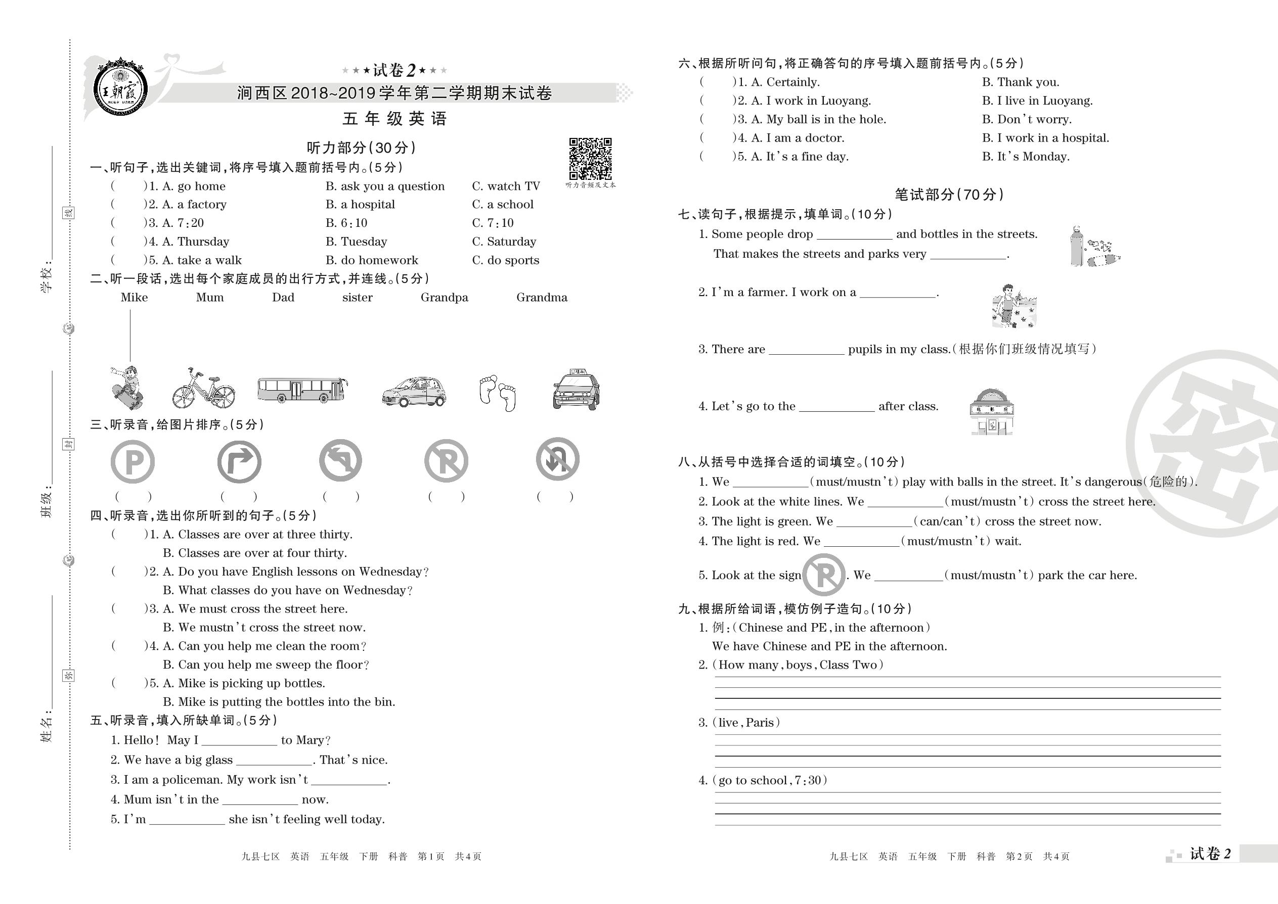 2018-2019学年第二学期洛阳市涧西区五年级英语试卷(科普版)_R210807133853【2】