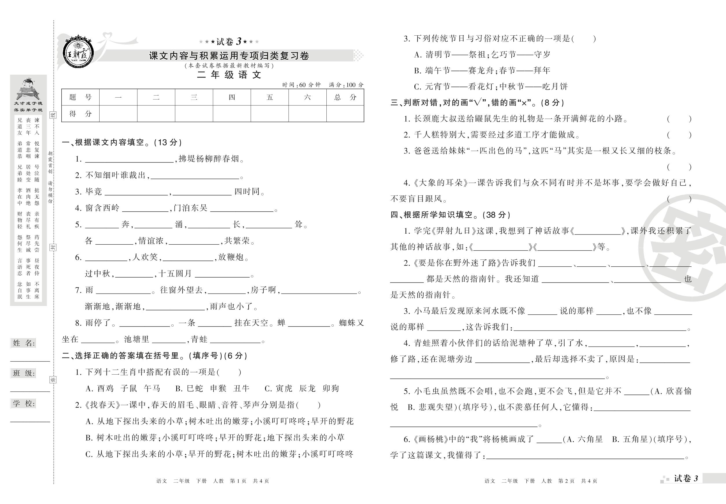 王朝霞期末专项卷——课文内容与积累运用专项归类复习卷二年级下册语文(人教版)_R21080181810【3】