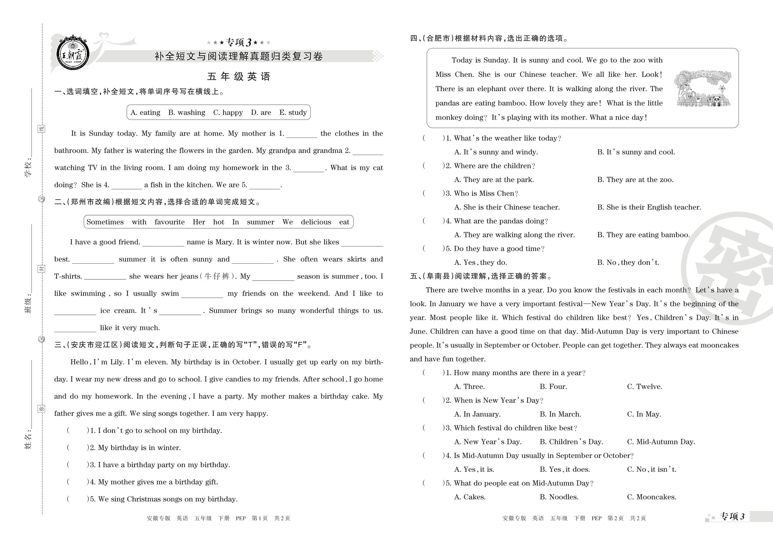 王朝霞期末专项卷——补全短文与阅读理解真题归类复习、任务型阅读五年级下册英语(PEP版)【0】