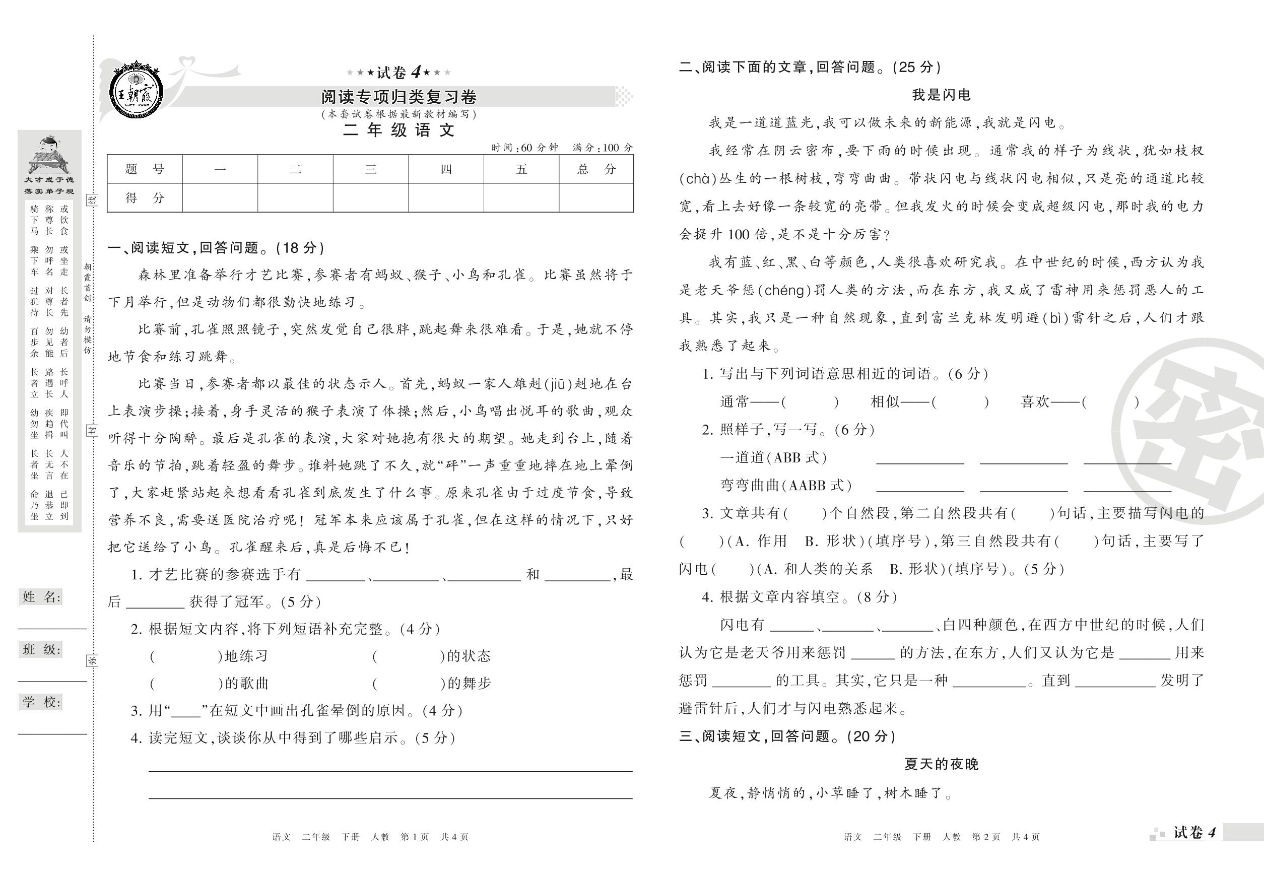 王朝霞期末专项卷——阅读专项归类复习卷二年级下册语文(人教版)_R21080181815【4】