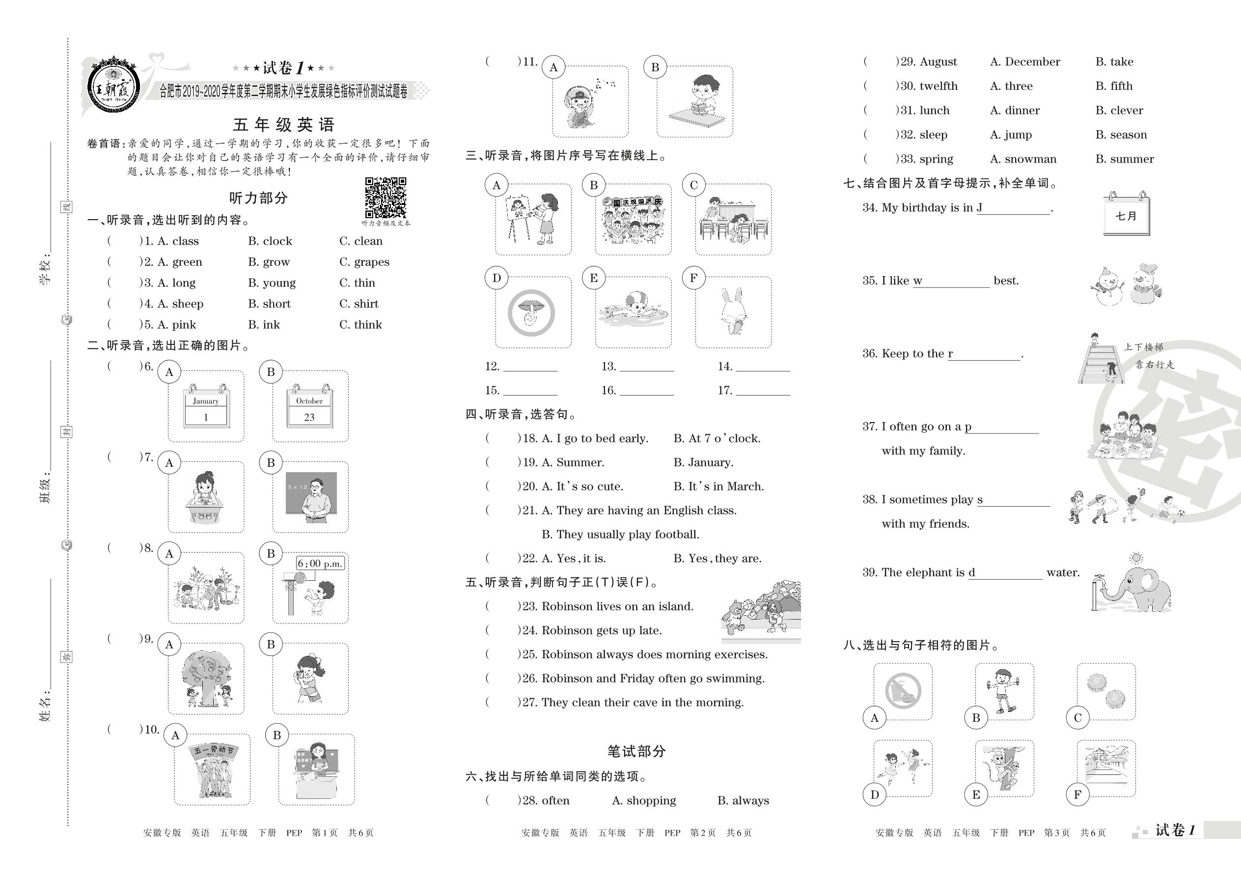 2019-2020学年第二学期合肥市五年级英语试卷(PEP版)【1】