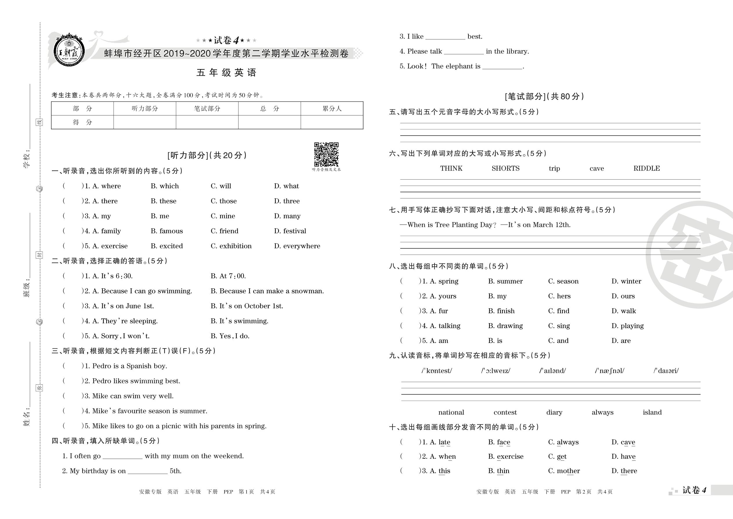 2019-2020学年第二学期蚌埠市经开区五年级英语试卷(PEP版)【4】