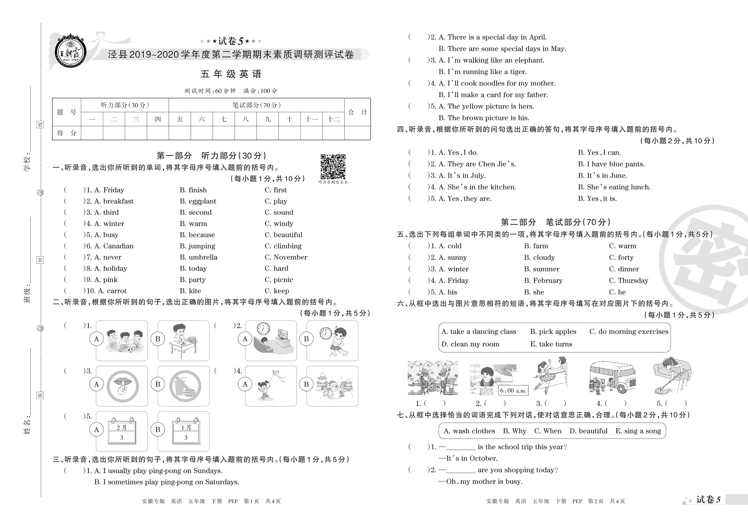 2019-2020学年第二学期宣城市泾县五年级英语试卷(PEP版)【5】