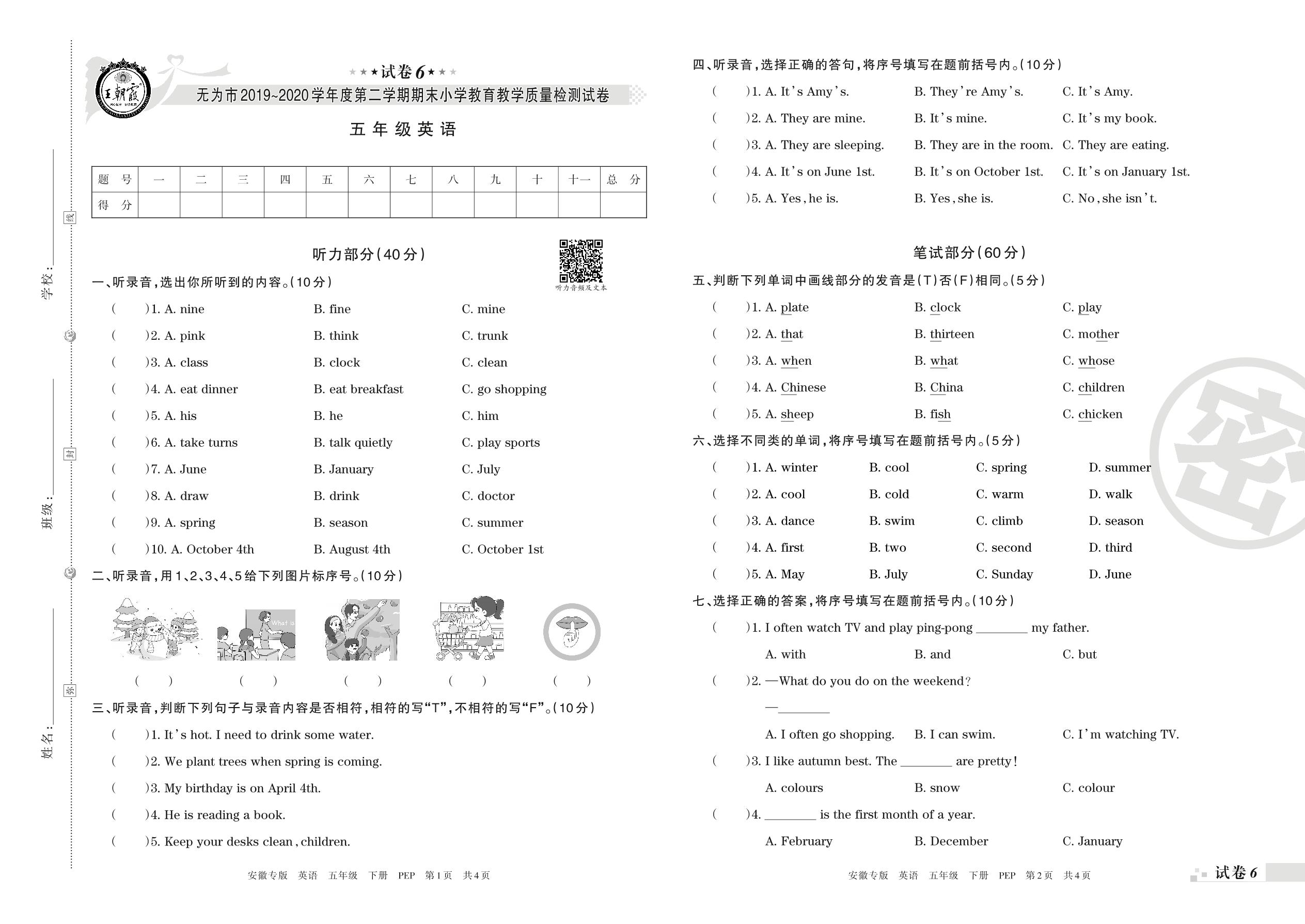 2019-2020学年第二学期无为市五年级英语试卷(PEP版)【6】