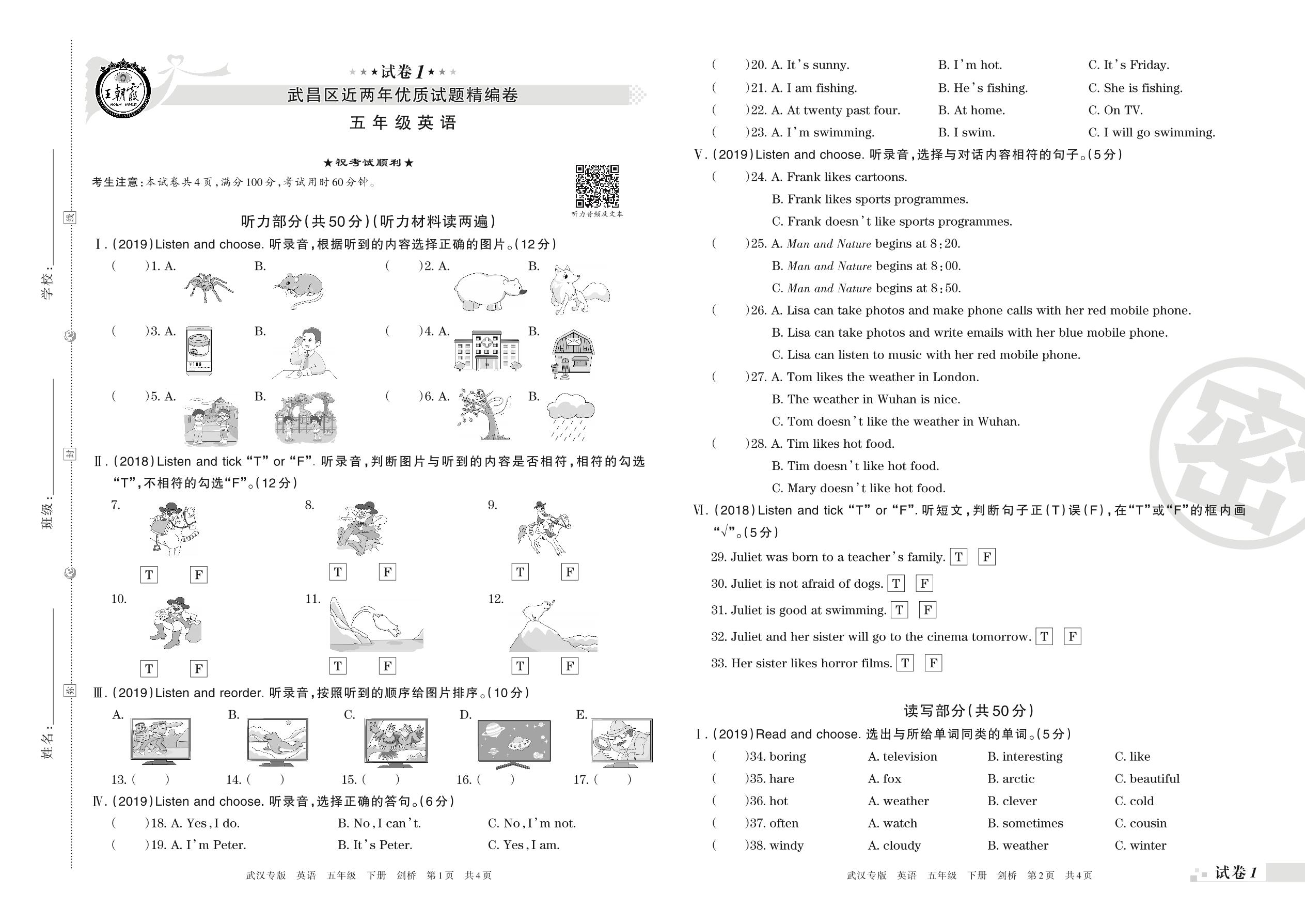 武汉市武昌区近两年优质试题精编卷五年级英语试卷(剑桥版)【1】