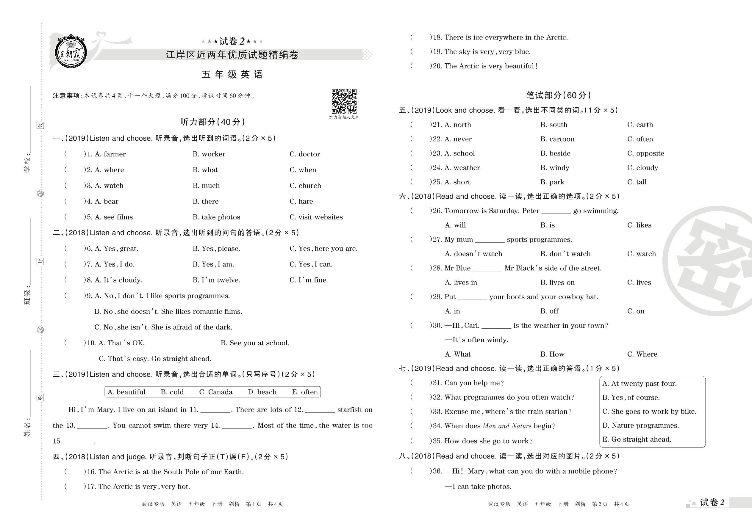 武汉市江岸区近两年优质试题精编卷五年级英语试卷(剑桥版)【2】