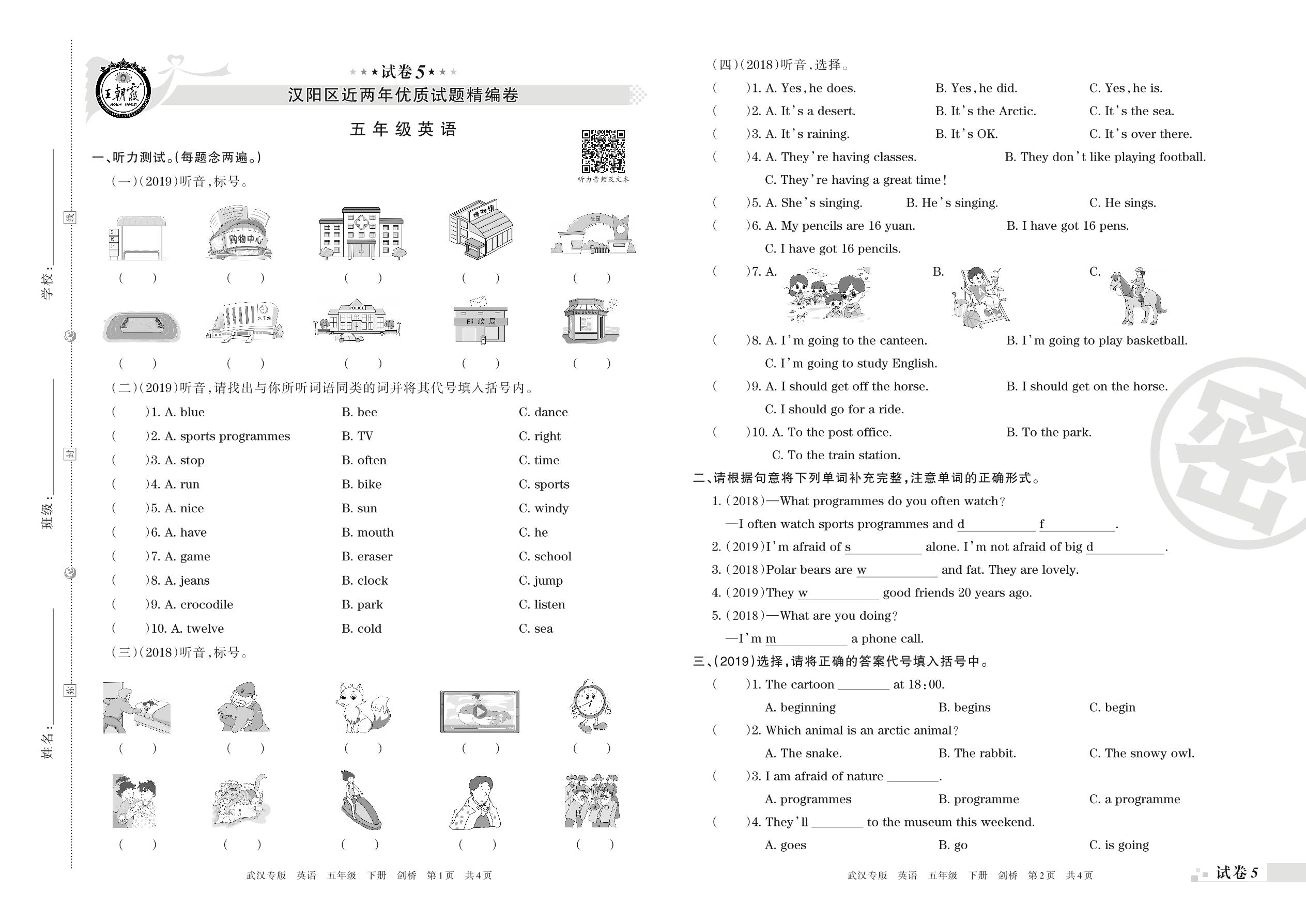 武汉市汉阳区近两年优质试题精编卷五年级英语试卷(剑桥版)【5】
