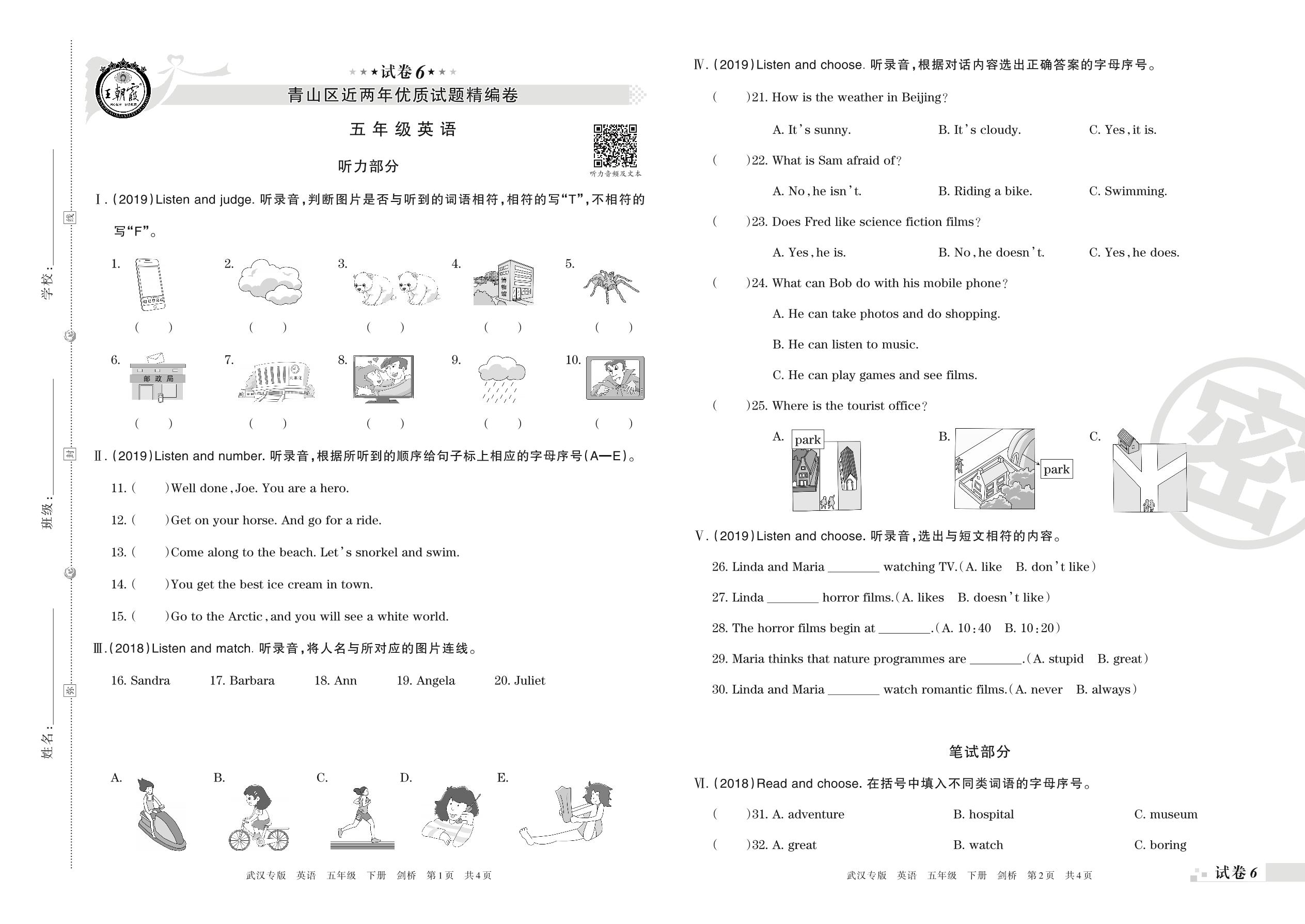 武汉市青山区近两年优质试题精编卷五年级英语试卷(剑桥版)【6】