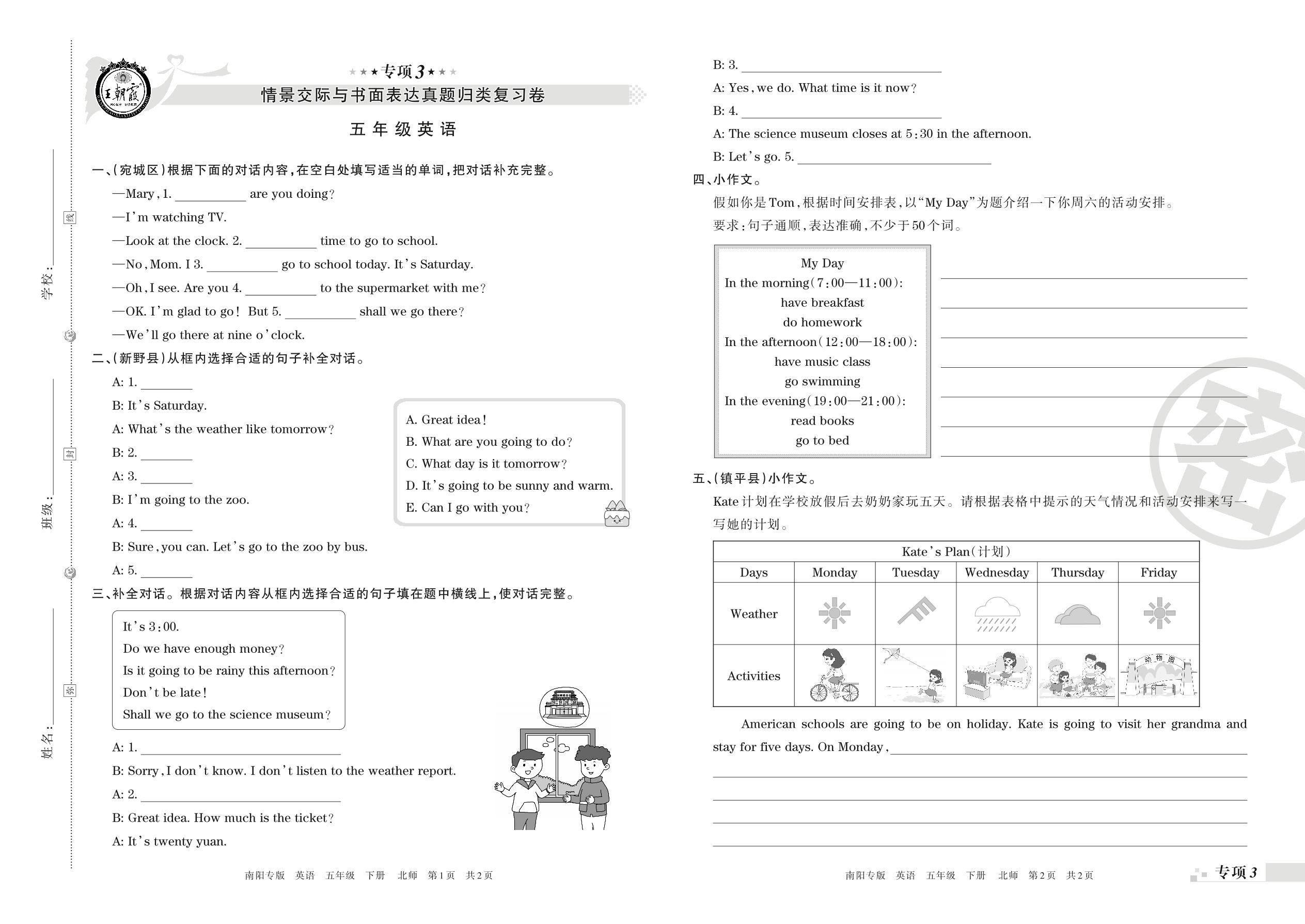 王朝霞期末专项卷——情景交际与书面表达、补全短文五年级下册英语(北师版)【0】