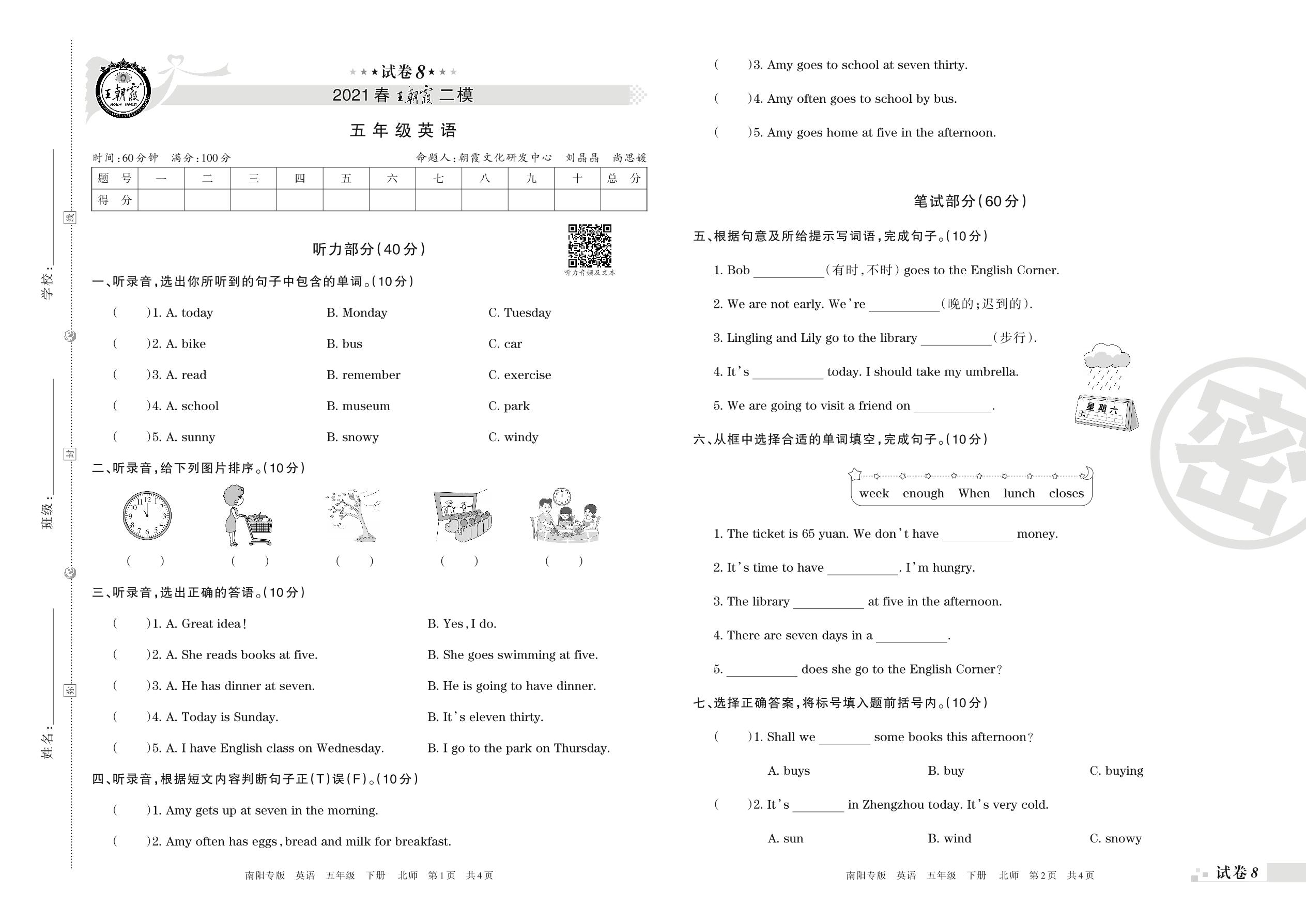 王朝霞期末模拟卷五年级下册英语(北师版)_R210807134321【8】