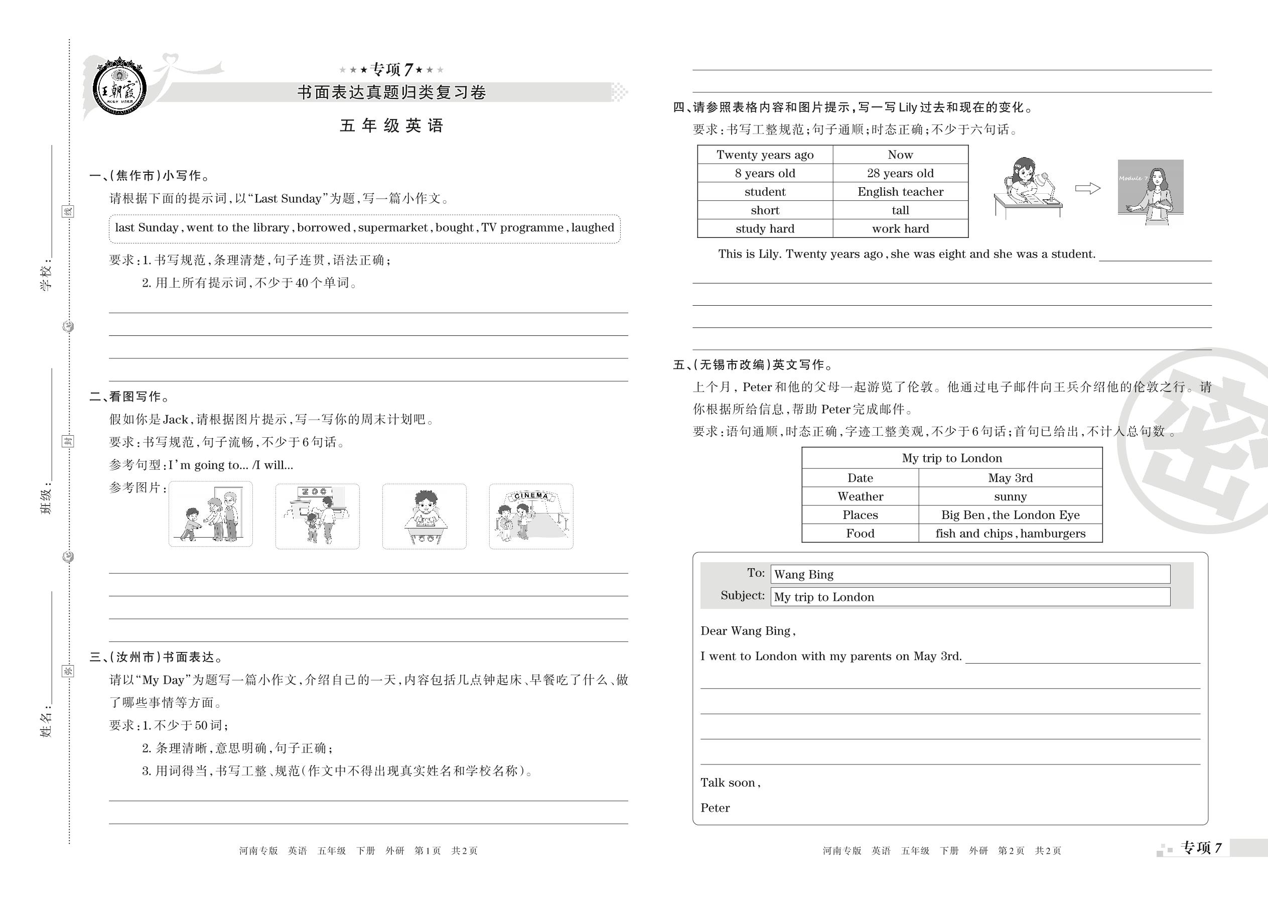王朝霞期末专项卷——书面表达真题归类复习、补全短文五年级下册英语(外研版)【0】