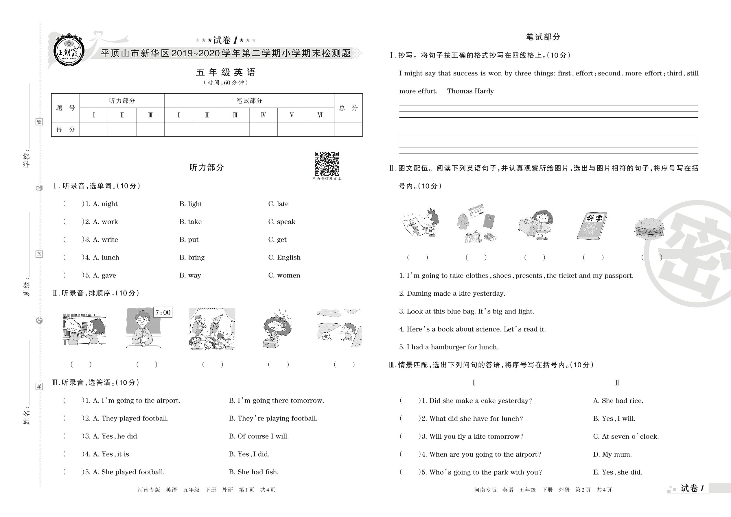 2019-2020学年第二学期平顶山市新华区五年级英语试卷(外研版)【1】