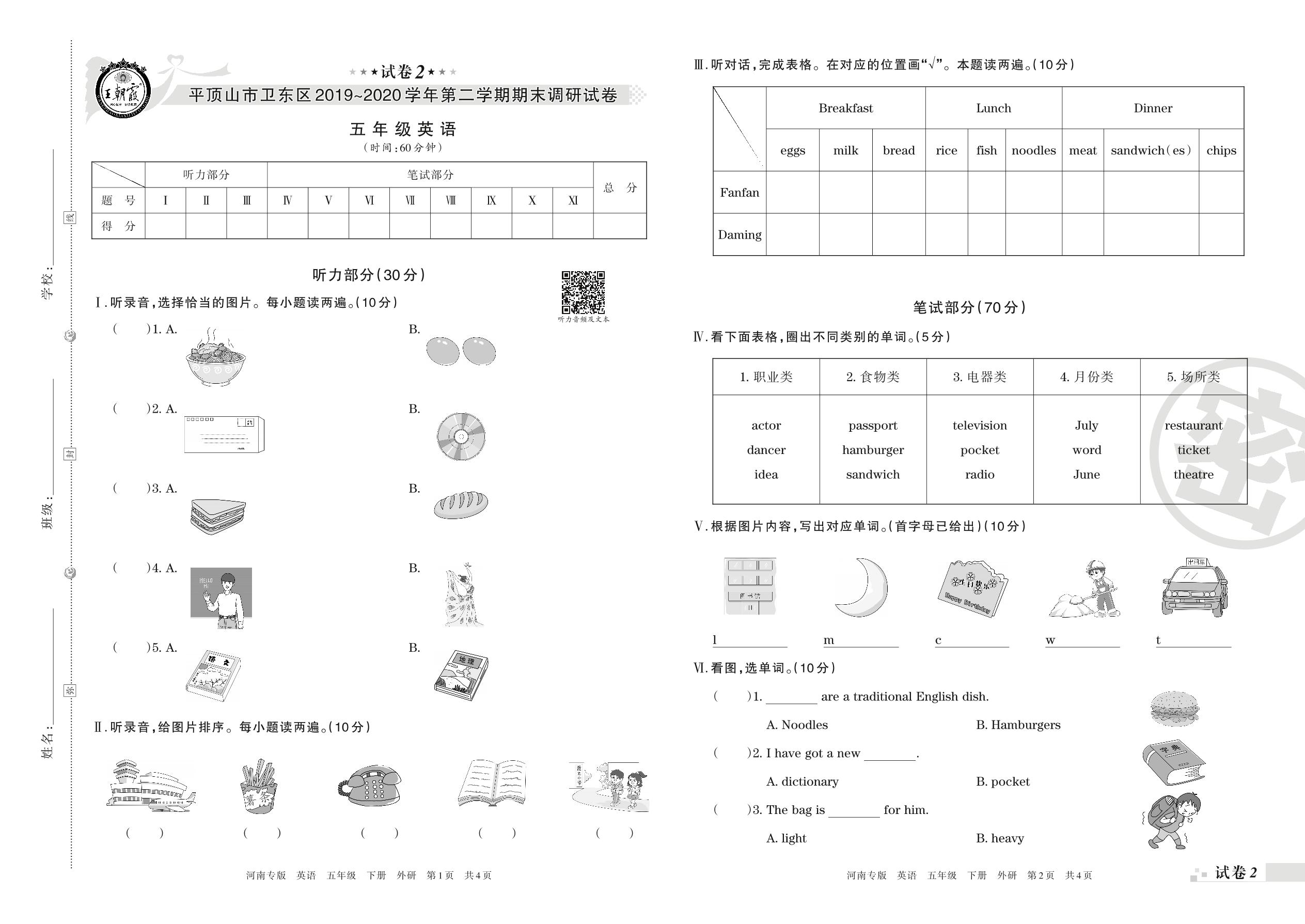 2019-2020学年第二学期平顶山市卫东区五年级英语试卷(外研版)【2】