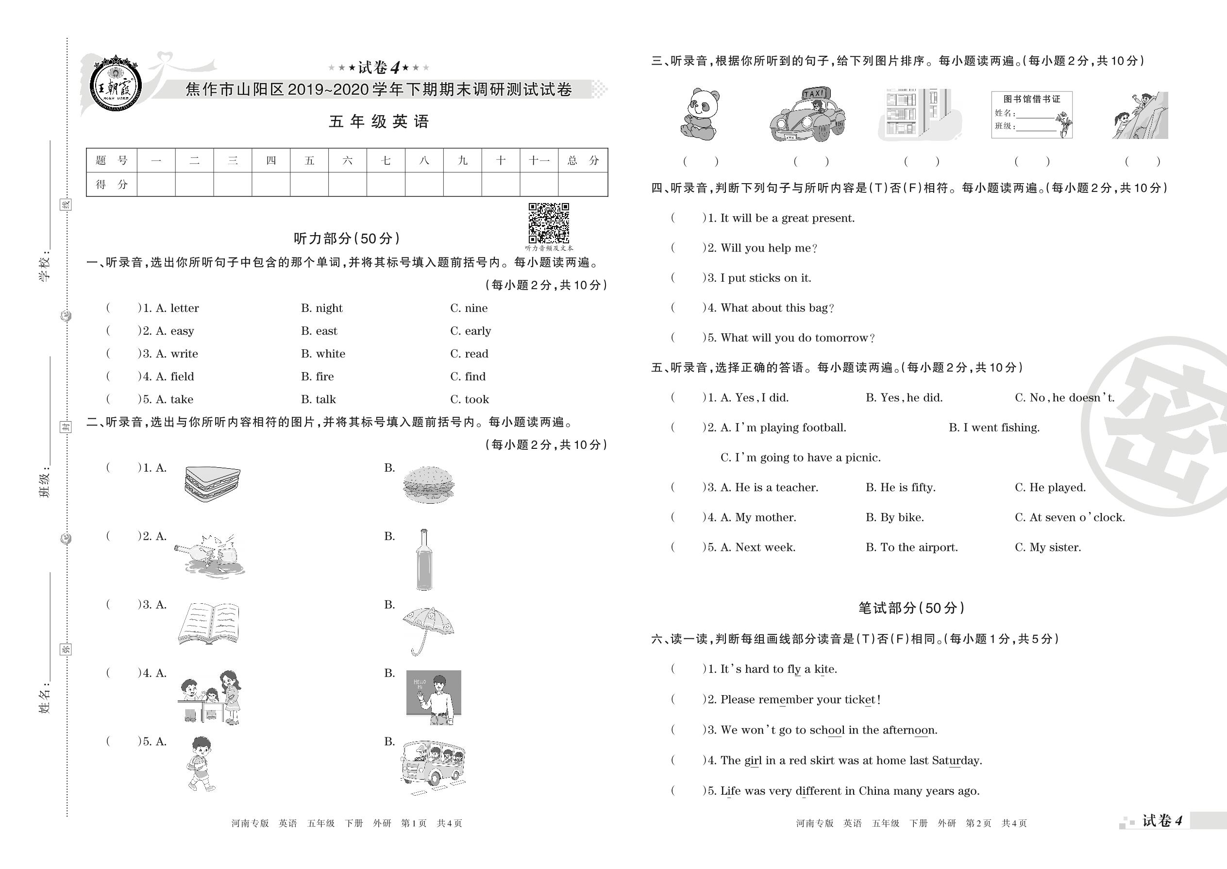 2019-2020学年第二学期焦作市山阳区五年级英语试卷(外研版)【4】