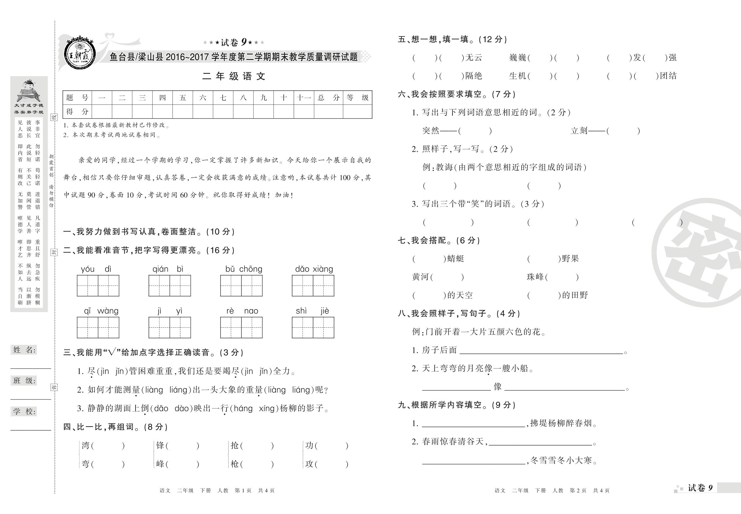 2016-2017学年第二学期济宁市鱼台县(梁山县)二年级语文试卷(人教版)【9】