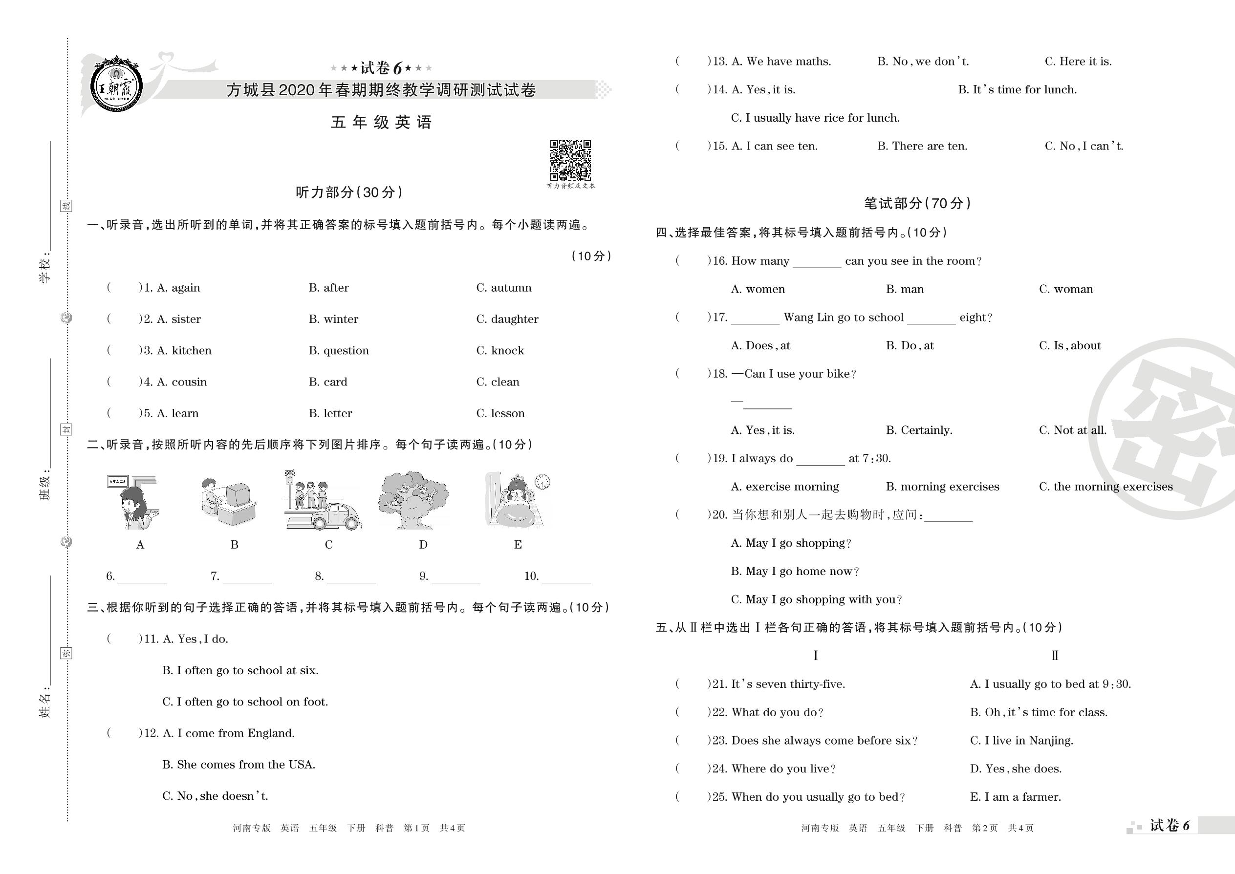 2019-2020学年第二学期南阳市方城县五年级英语试卷(科普版)【6】