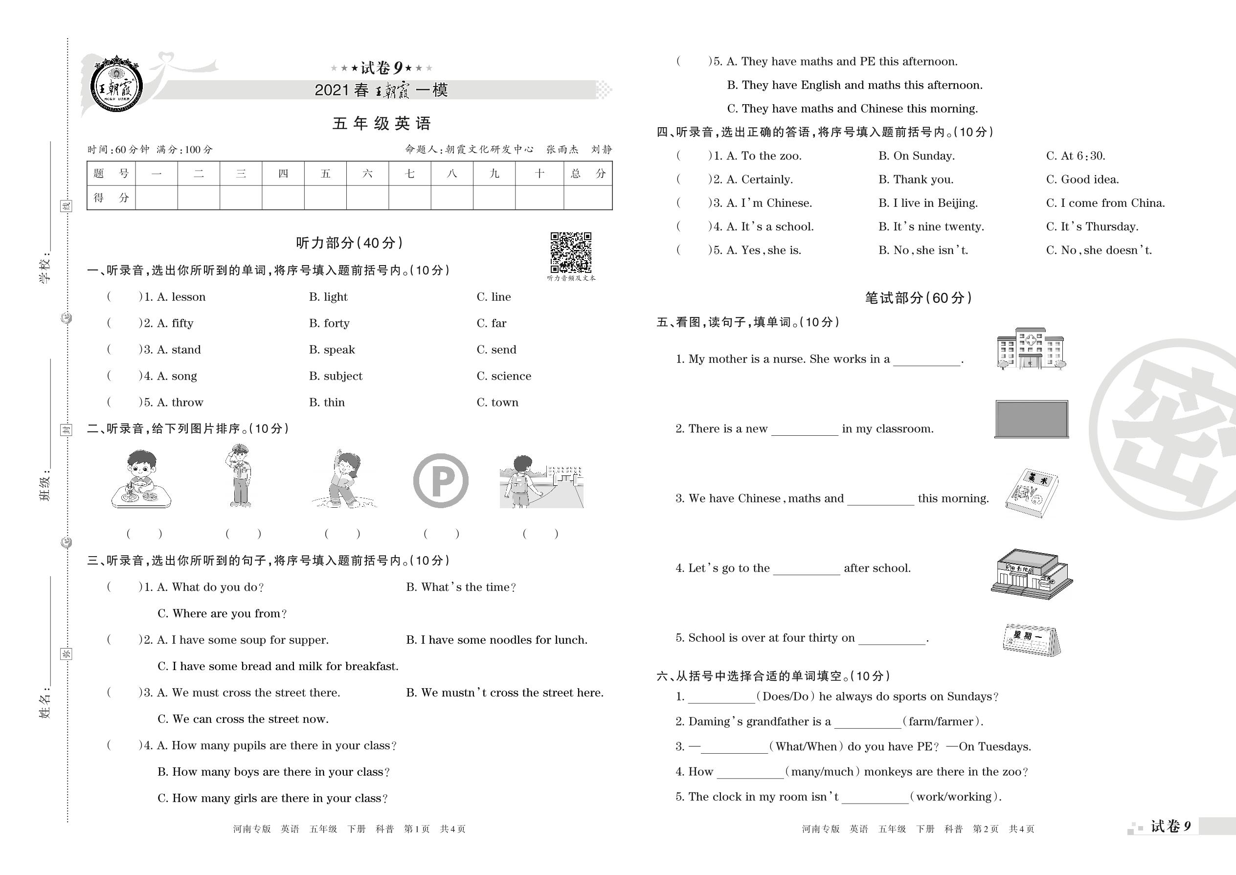 王朝霞期末模拟卷五年级下册英语(科普版)_R210807134526【9】