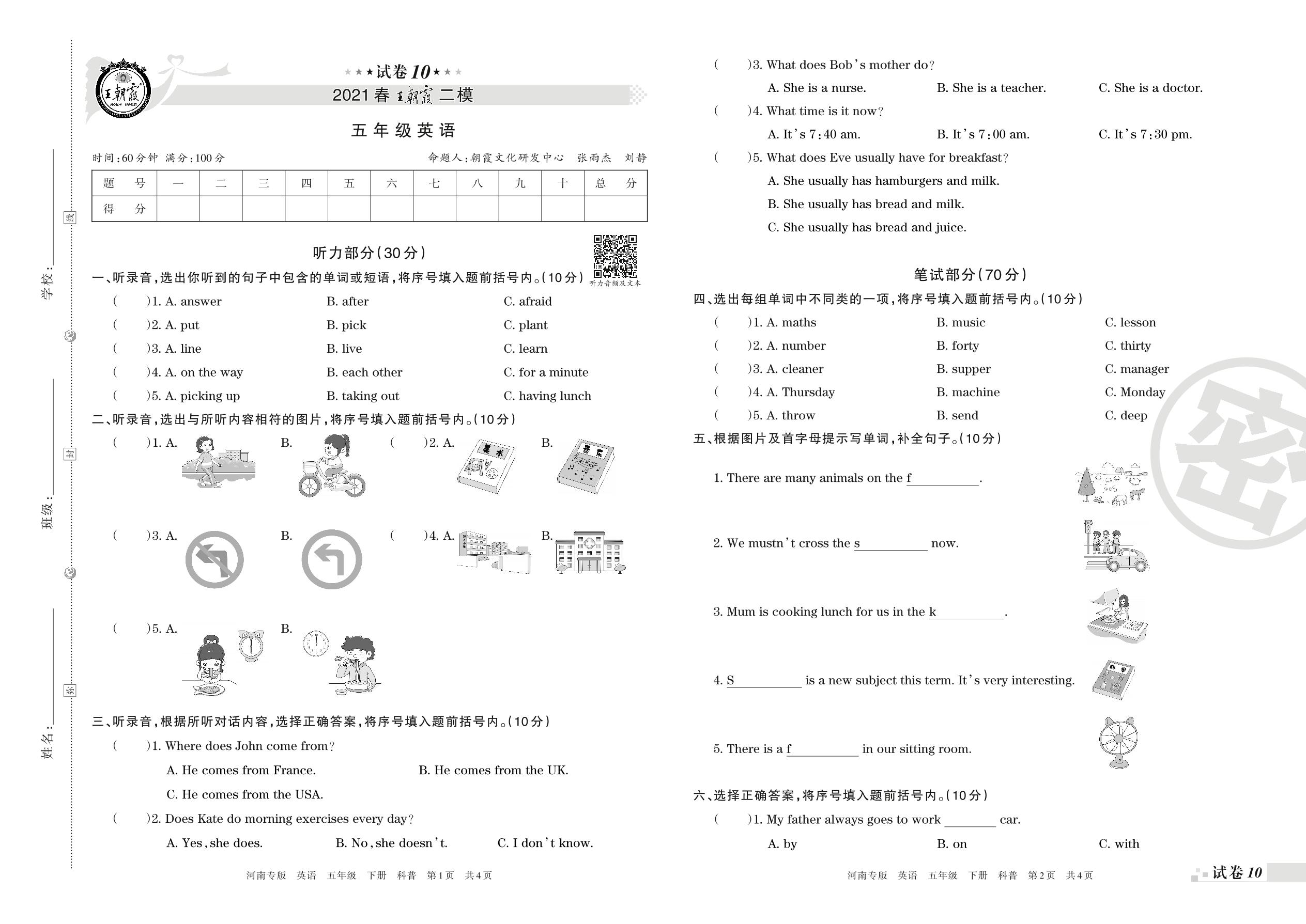 王朝霞期末模拟卷五年级下册英语(科普版)_R210807134529【10】