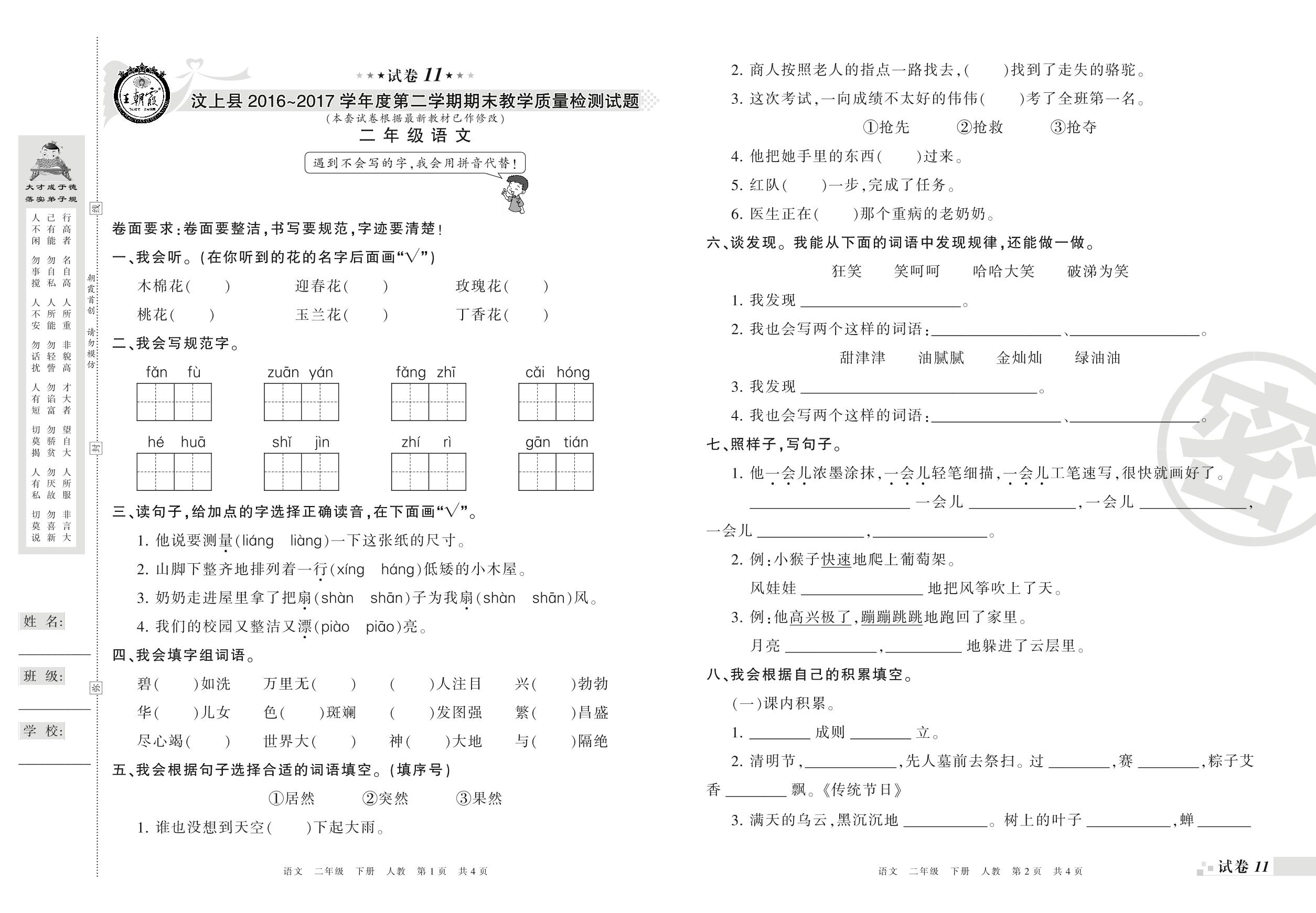 2016-2017学年第二学期济宁市汶上县二年级语文试卷(人教版)【11】
