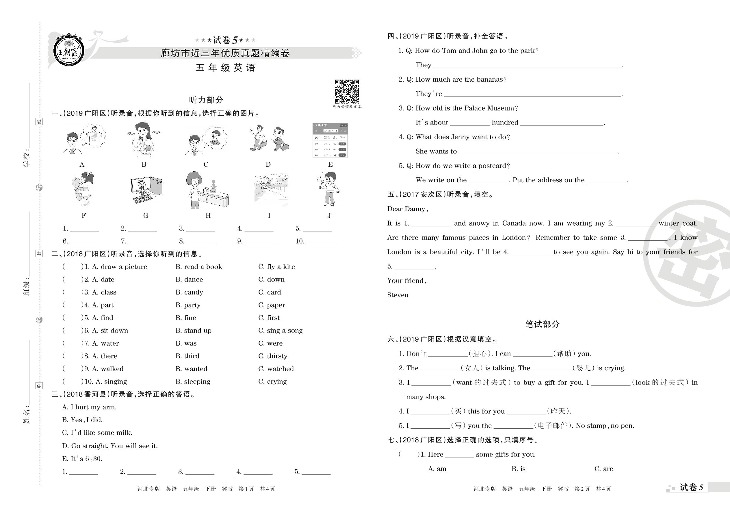 廊坊市近三年优质真题精编卷五年级下册英语(冀教版)【5】