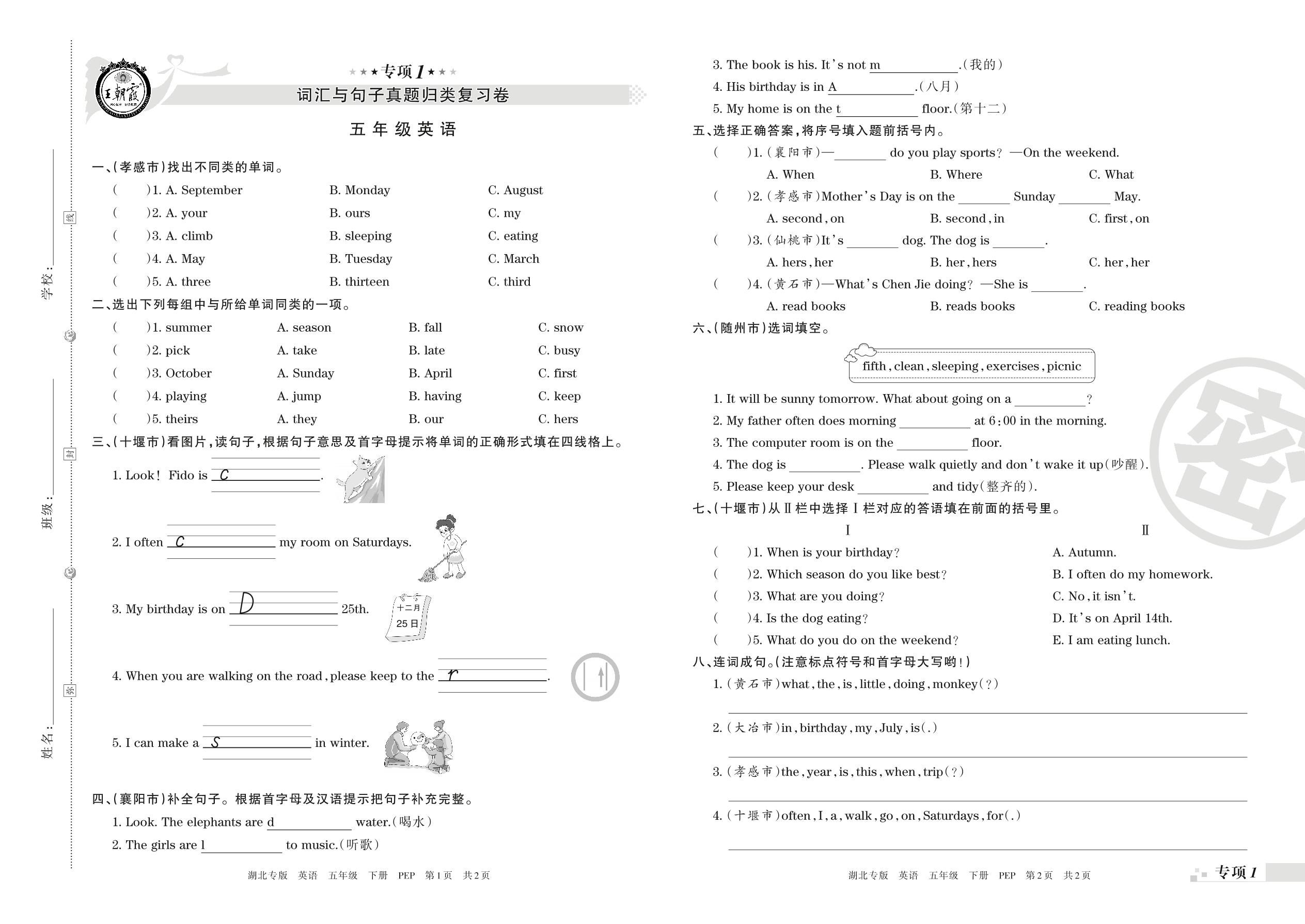 五年级英语人教PEP版(三起始)下册专项卷