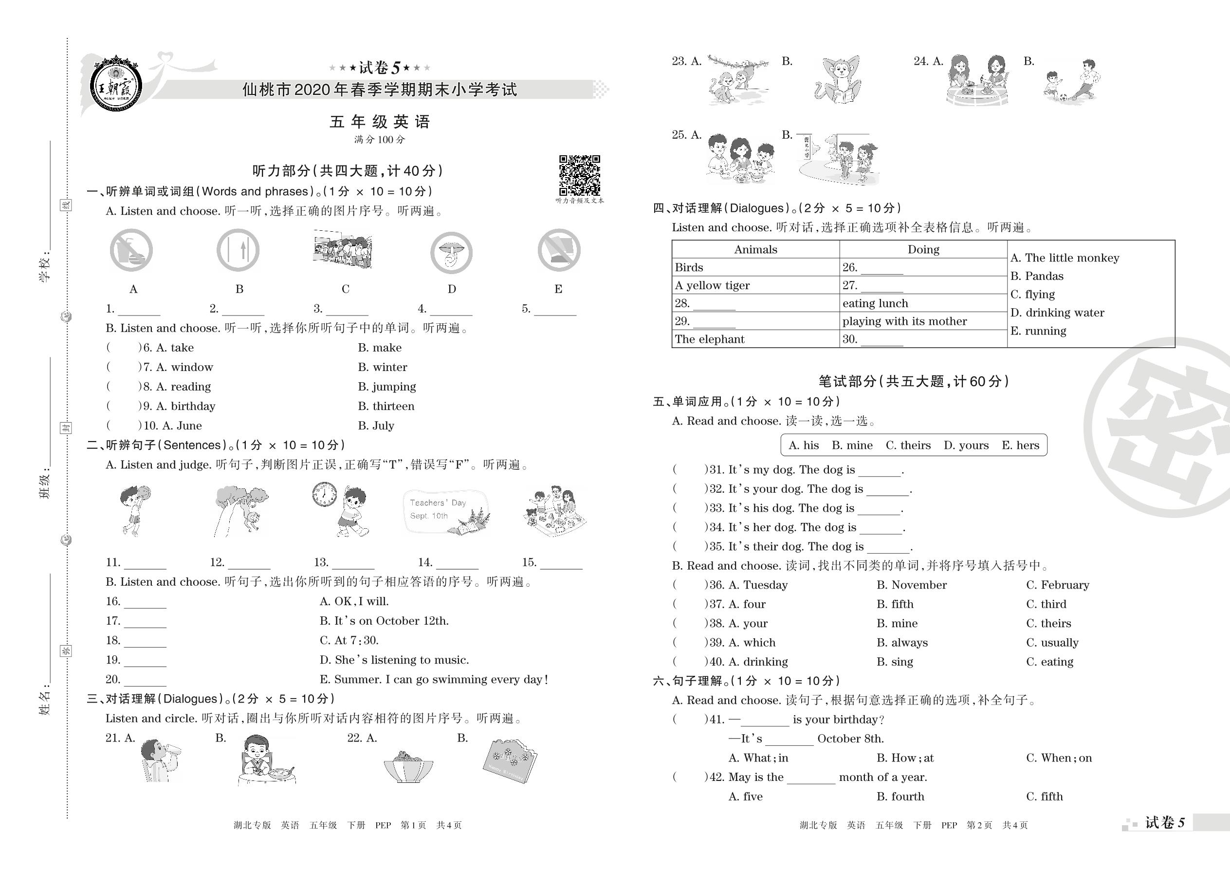 2019-2020学年第二学期仙桃市五年级英语试卷(PEP版)【5】