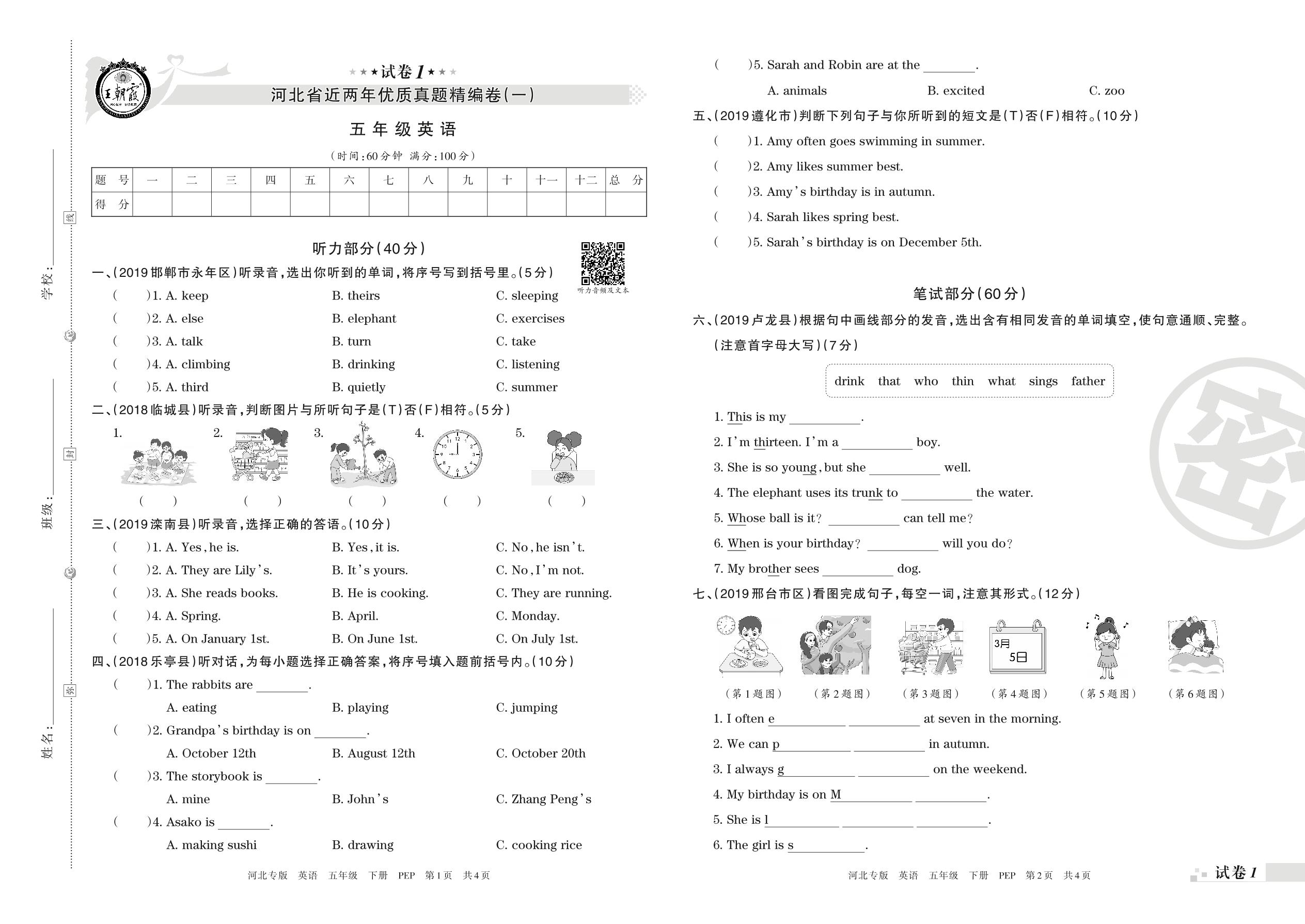 河北省近两年优质真题精编卷(一)五年级下册英语(PEP版)【1】