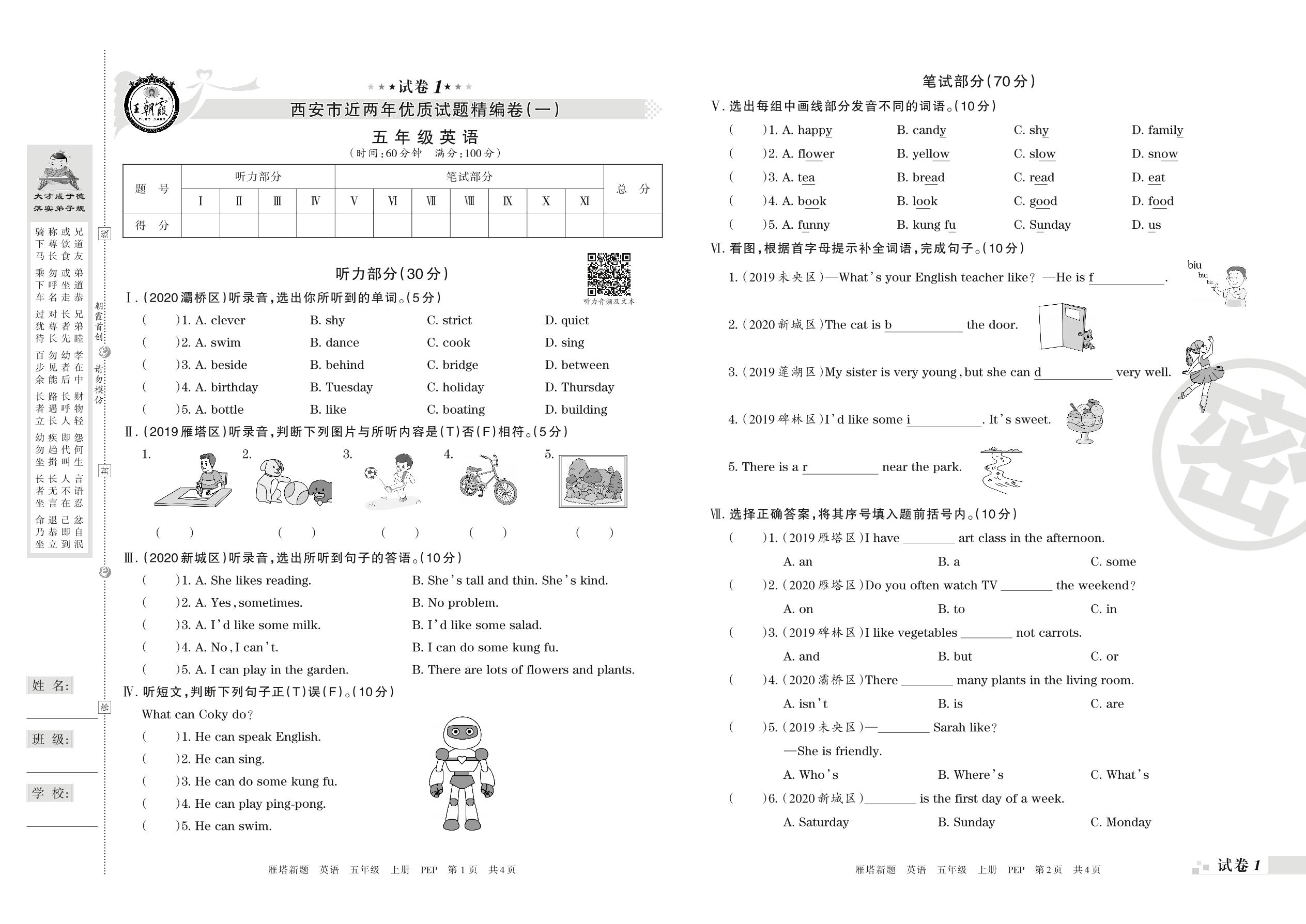 西安市近两年优质试题精编卷(一)五年级上册英语(PEP版)【1】