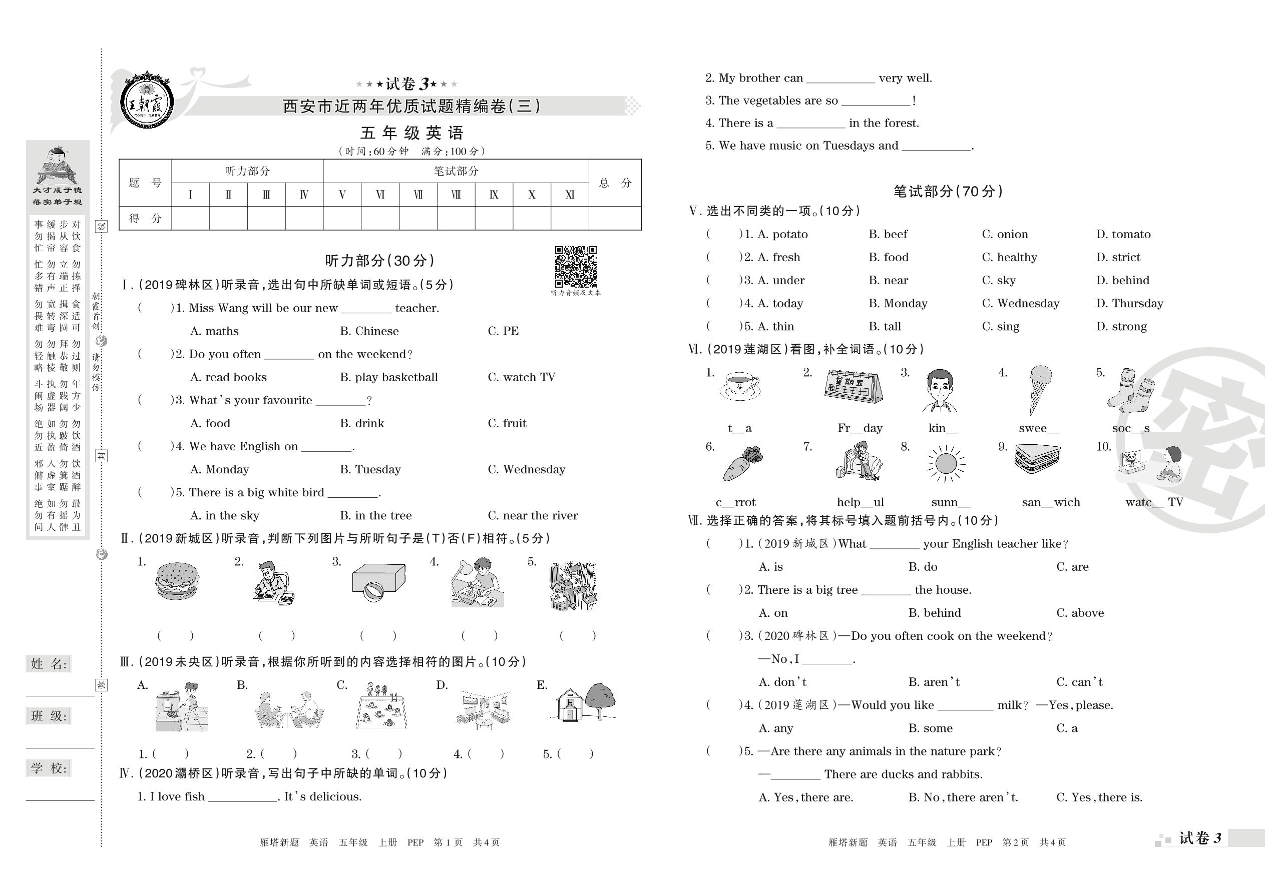 西安市近两年优质试题精编卷(三)五年级上册英语(PEP版)【3】