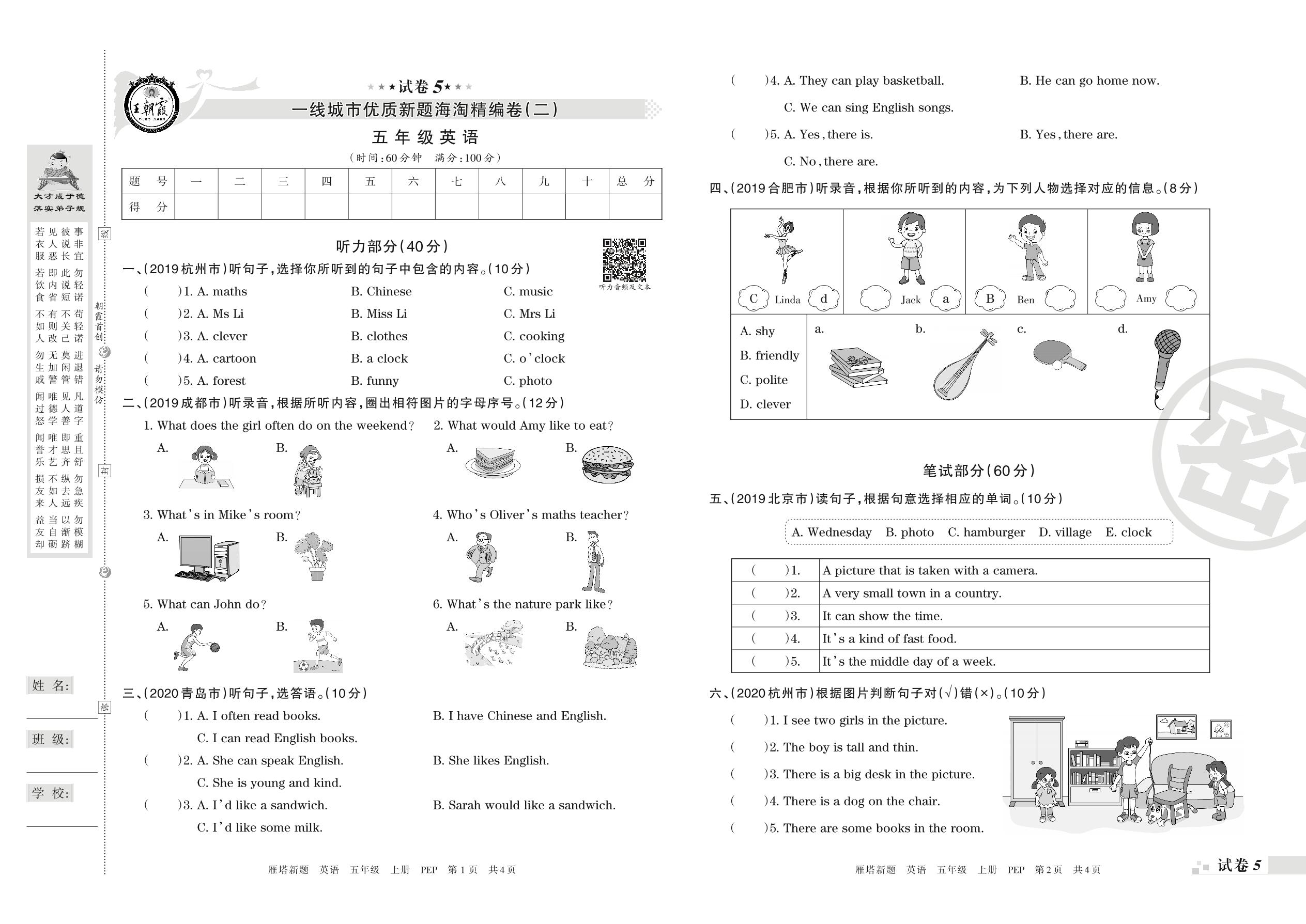 五年级英语人教PEP版(三起始)上册期末卷