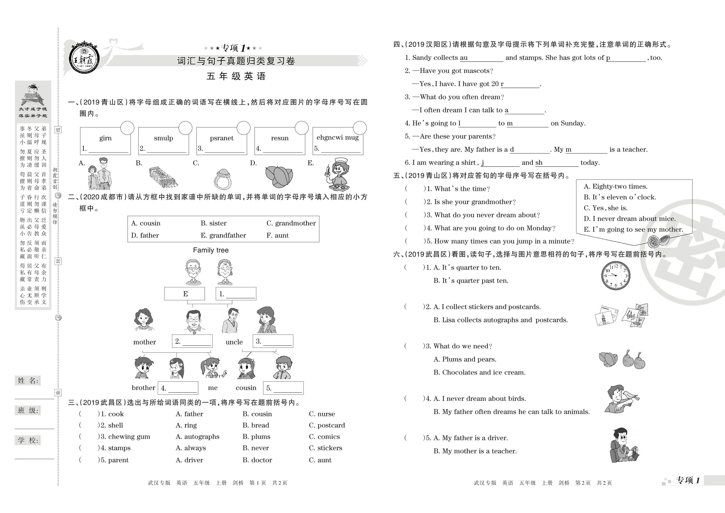 王朝霞期末专项卷——词汇与句子、阅读理解真题归类复习五年级上册英语(剑桥版)【0】