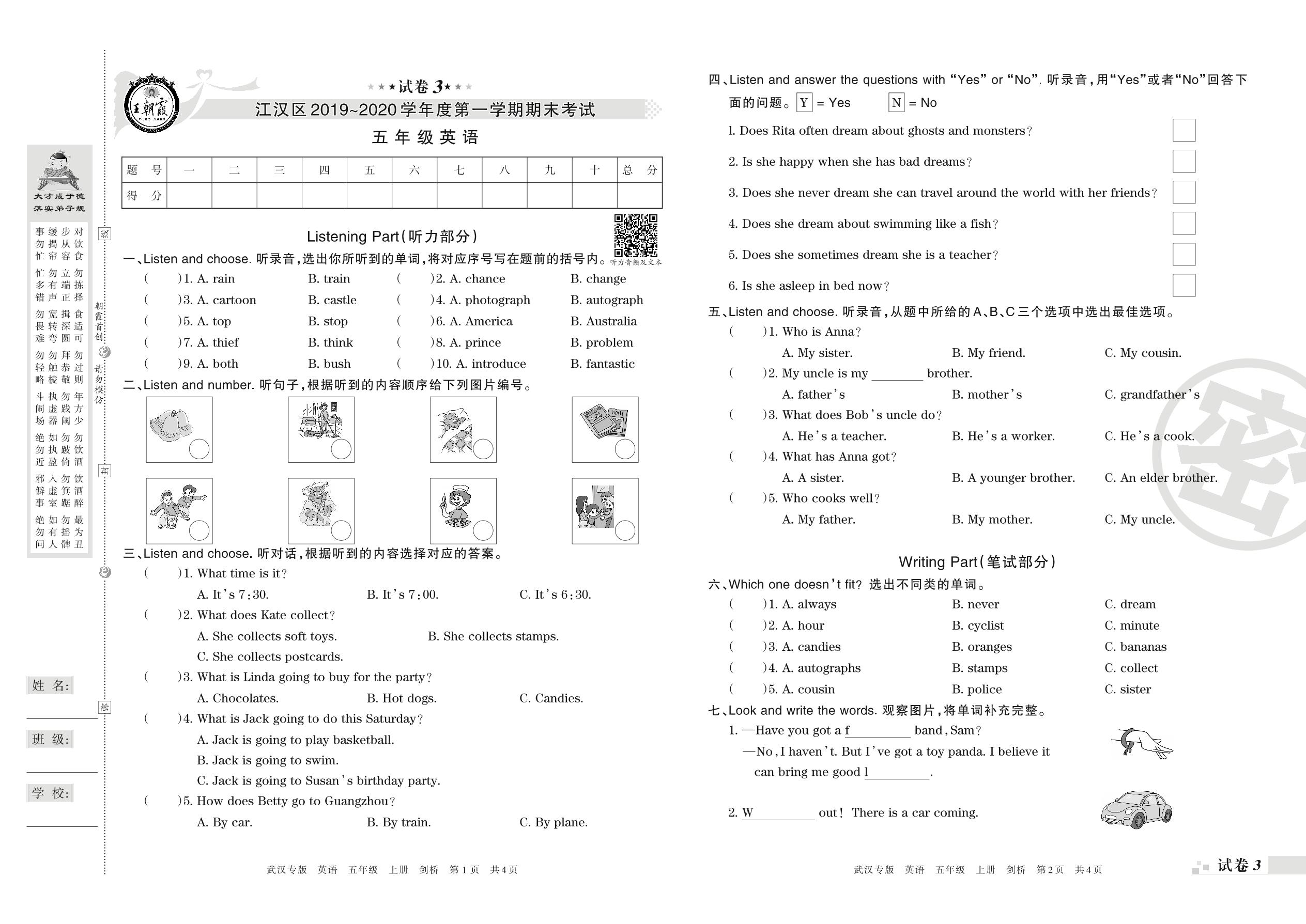 2019-2020学年第一学期武汉市江汉区五年级英语试卷(剑桥版)【3】