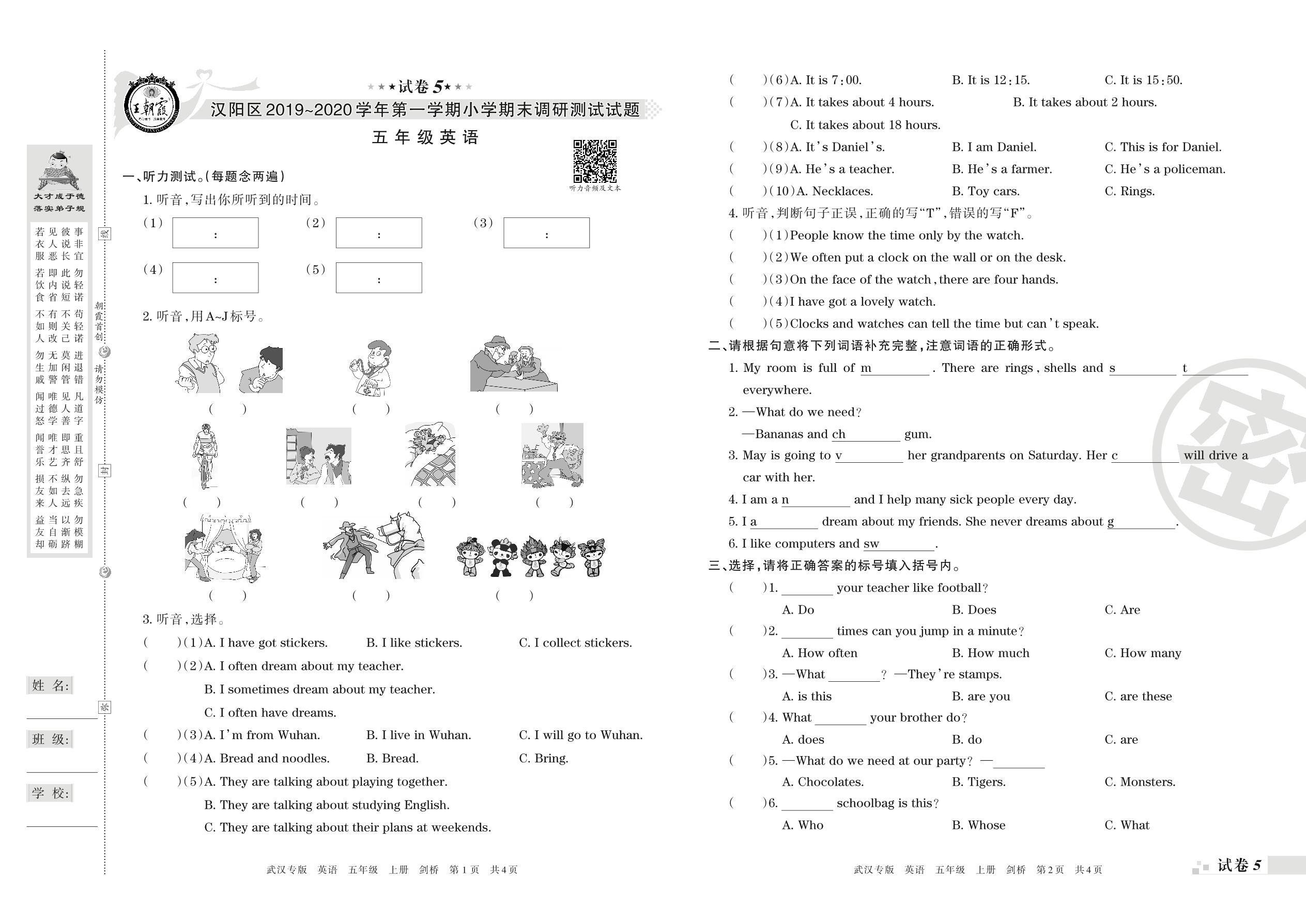 2019-2020学年第一学期武汉市汉阳区五年级英语试卷(剑桥版)【5】