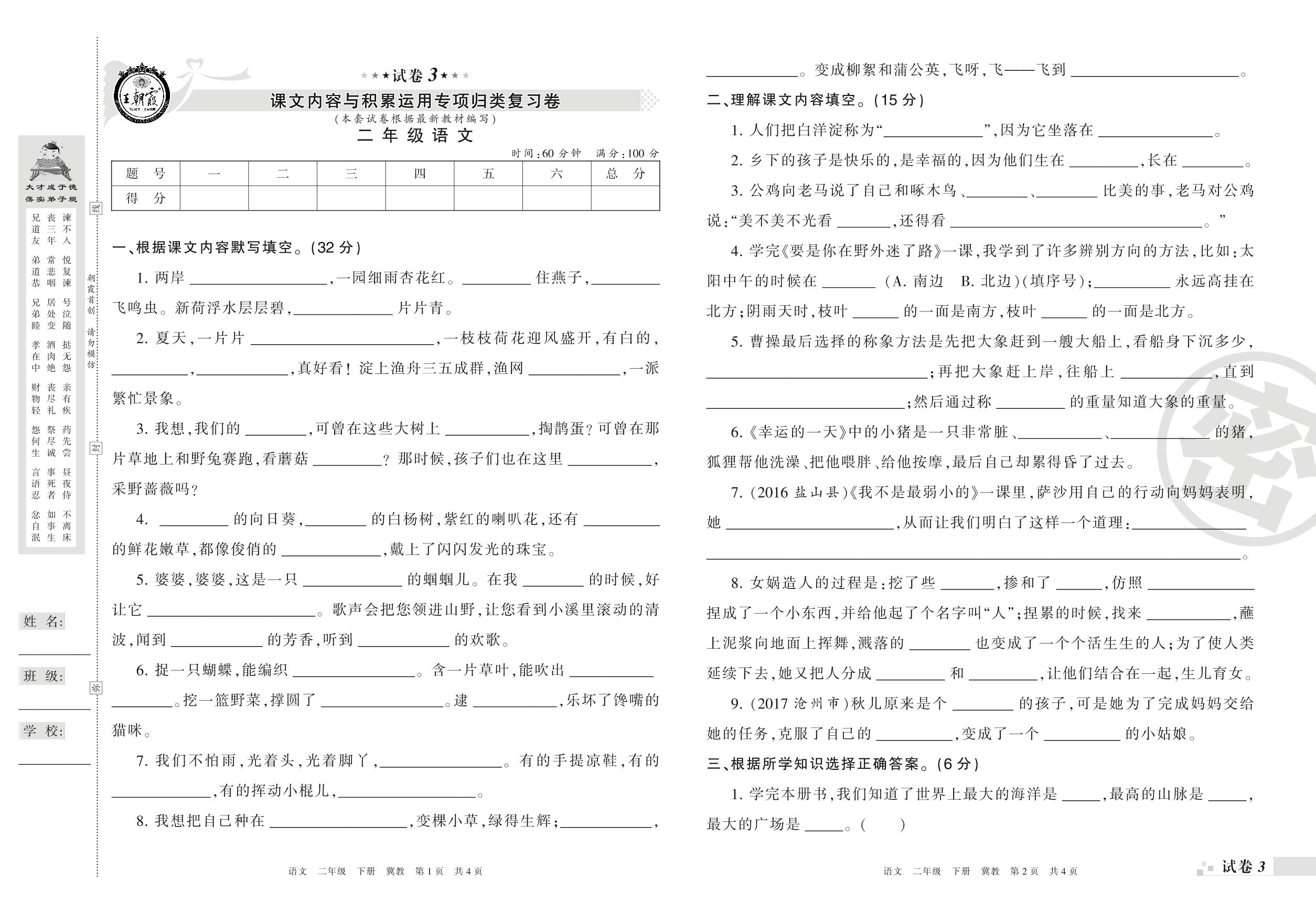 王朝霞期末专项卷——课文内容与积累运用专项归类复习卷二年级下册语文(冀教版)_R21080181913【3】