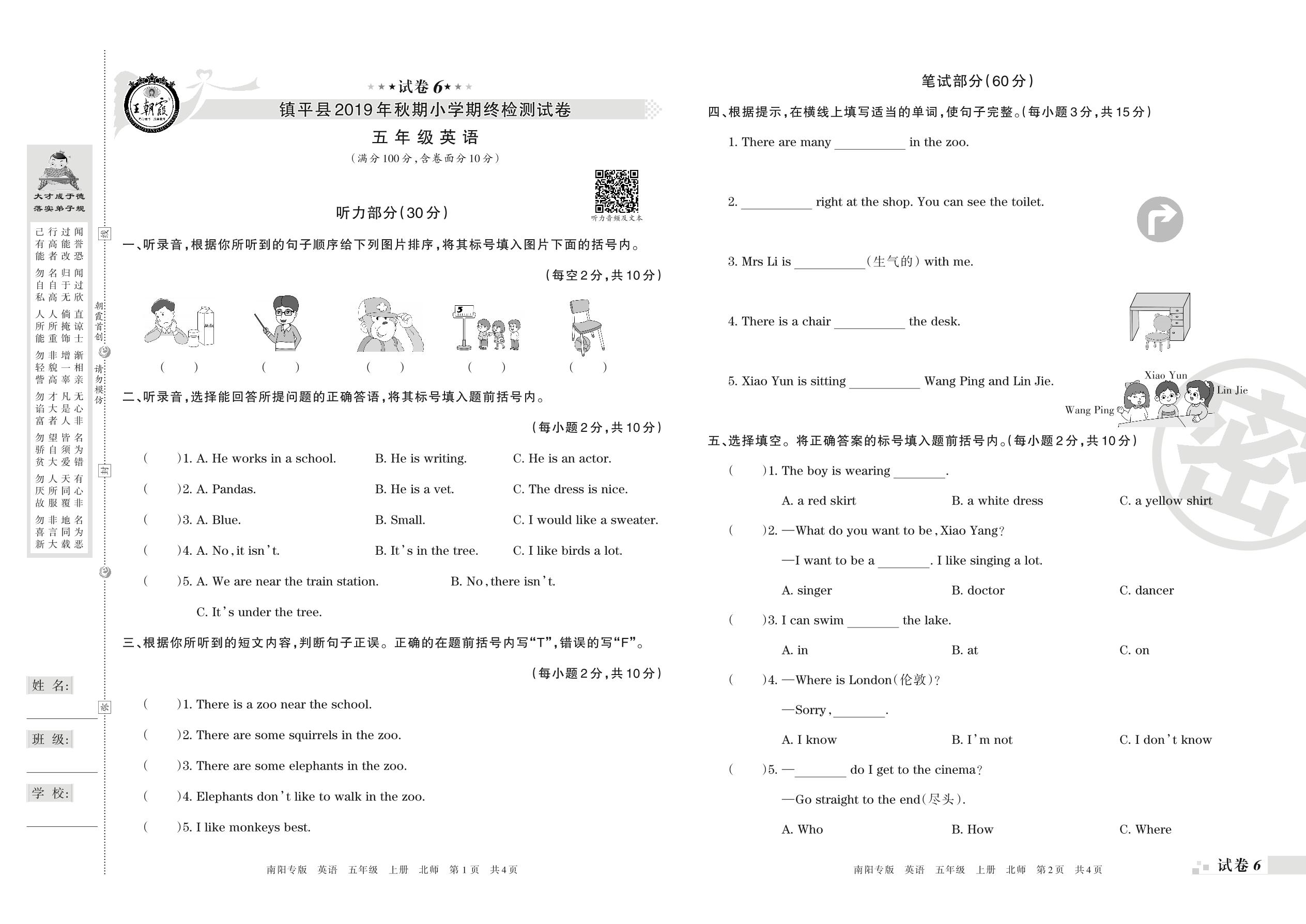 2019-2020学年第一学期南阳市镇平县五年级英语试卷(北师版)【6】