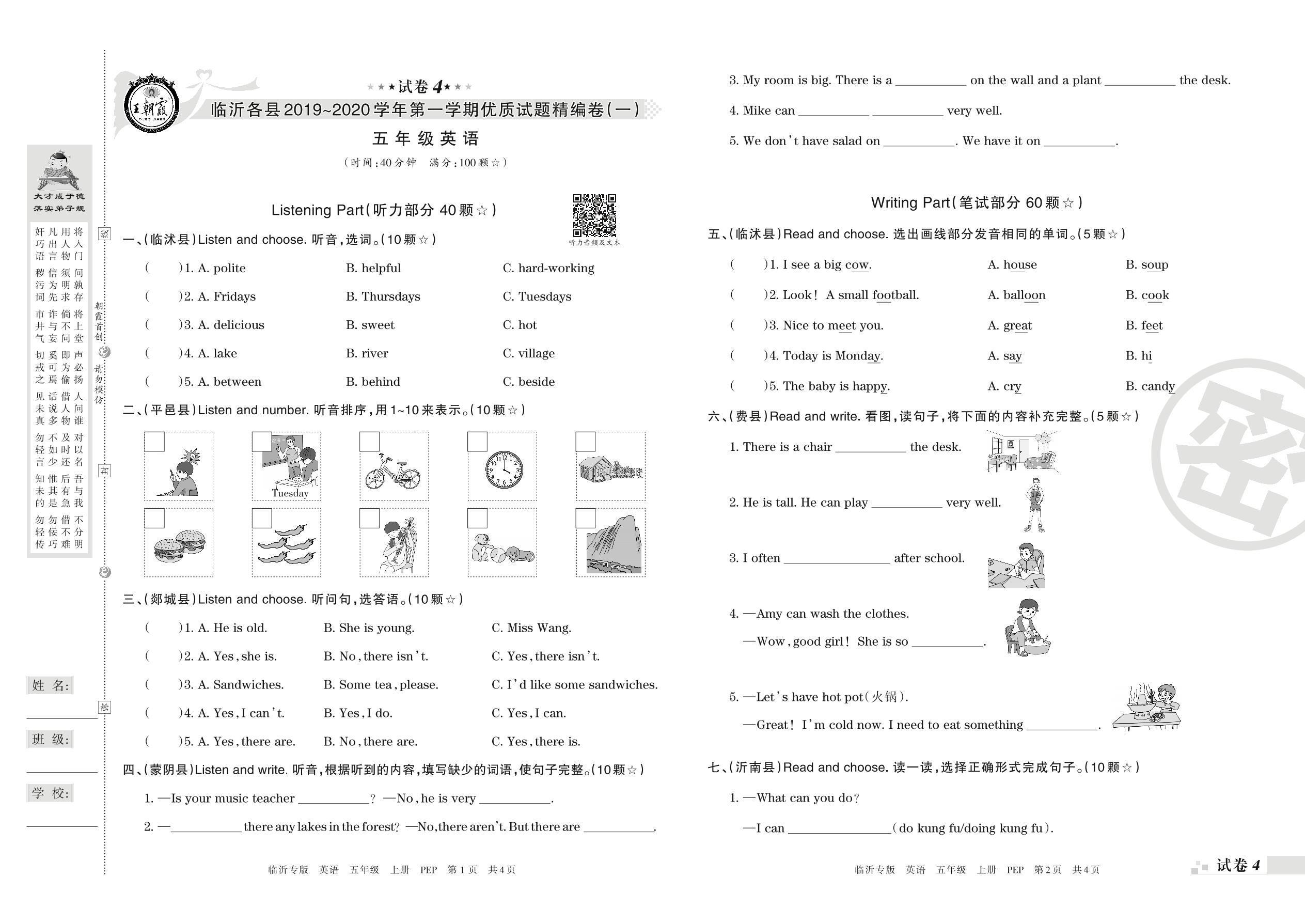 2019-2020学年第一学期临沂市各县优质试题精编卷(一)五年级英语试卷(PEP版)【4】