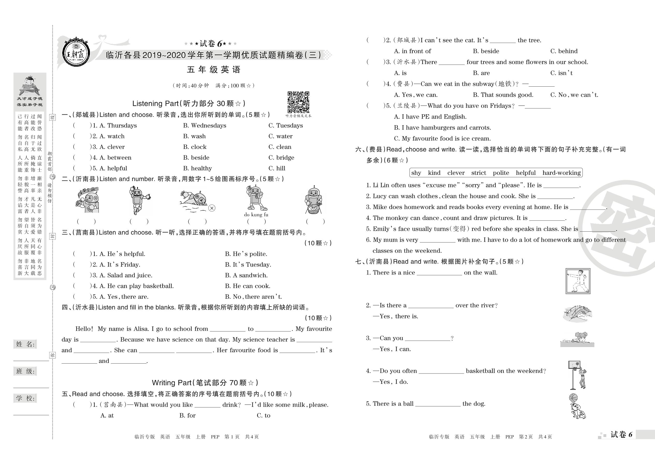 2019-2020学年第一学期临沂市各县优质试题精编卷(三)五年级英语试卷(PEP版)【6】