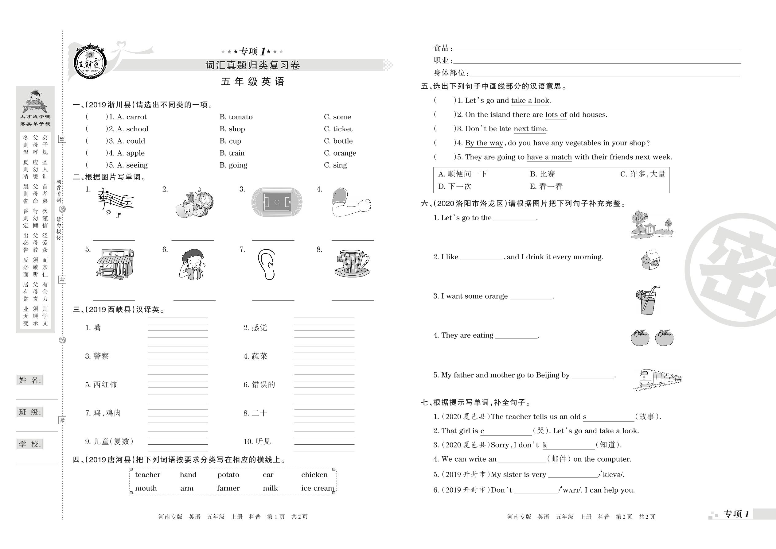 王朝霞期末专项卷——词汇、句子真题归类复习五年级上册英语(科普版)【0】