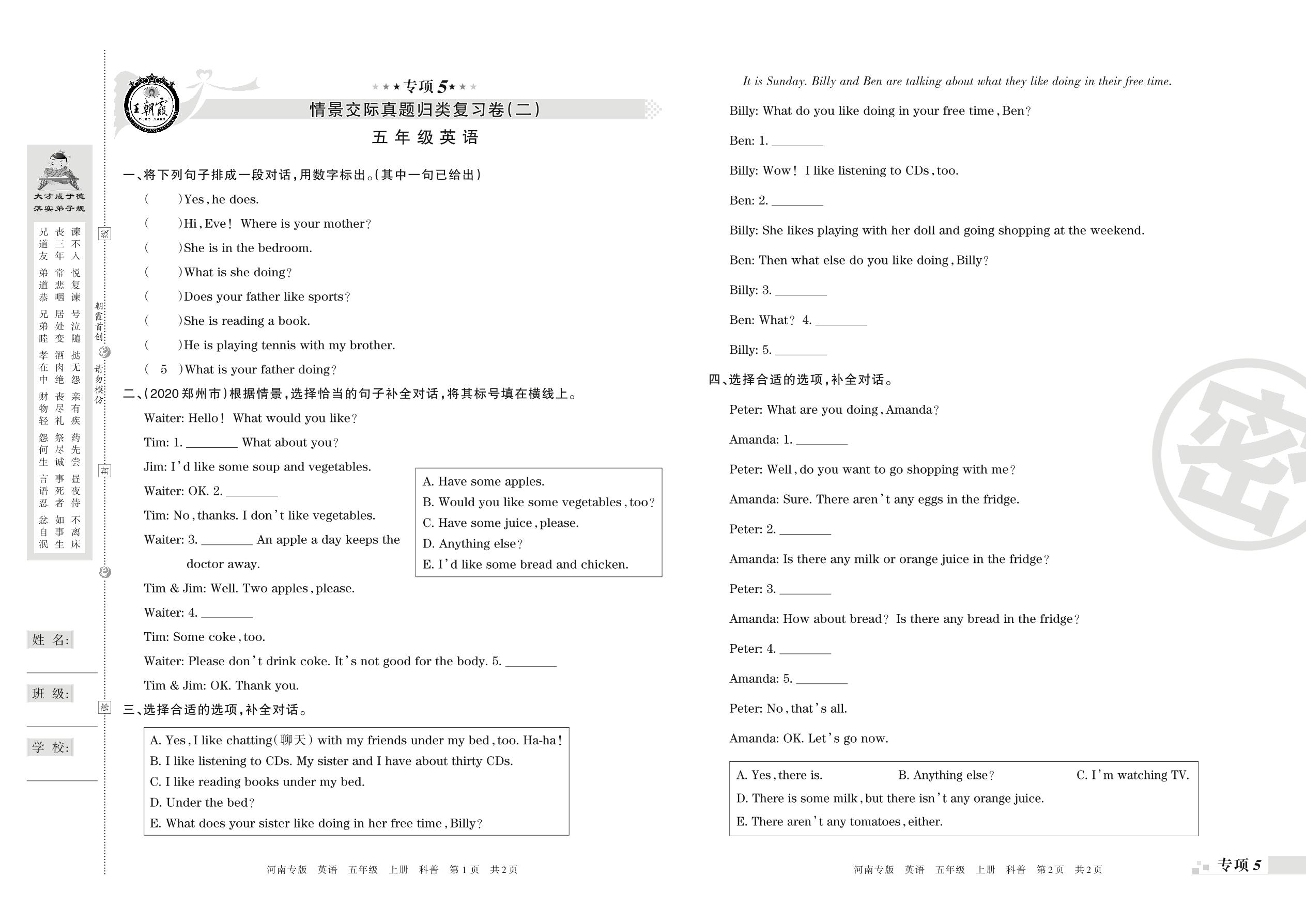 王朝霞期末专项卷——情景交际、阅读理解真题归类复习五年级上册英语(科普版)【0】