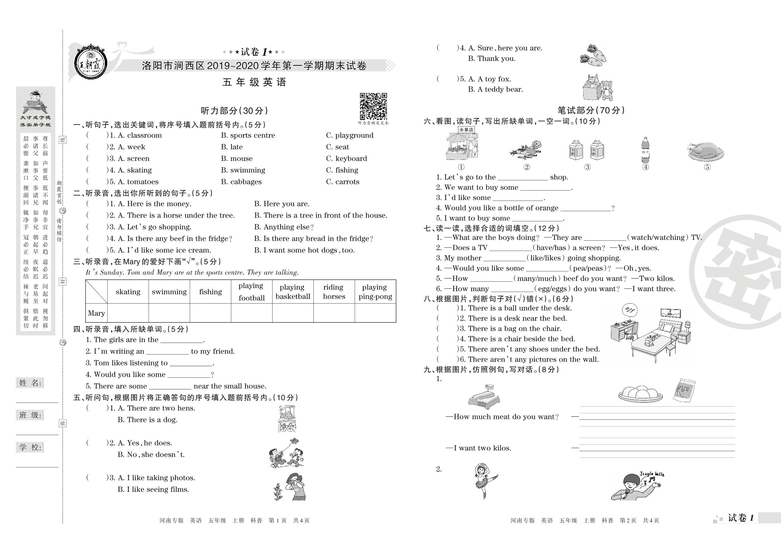 2019-2020学年第一学期洛阳市涧西区五年级英语试卷(科普版)【1】