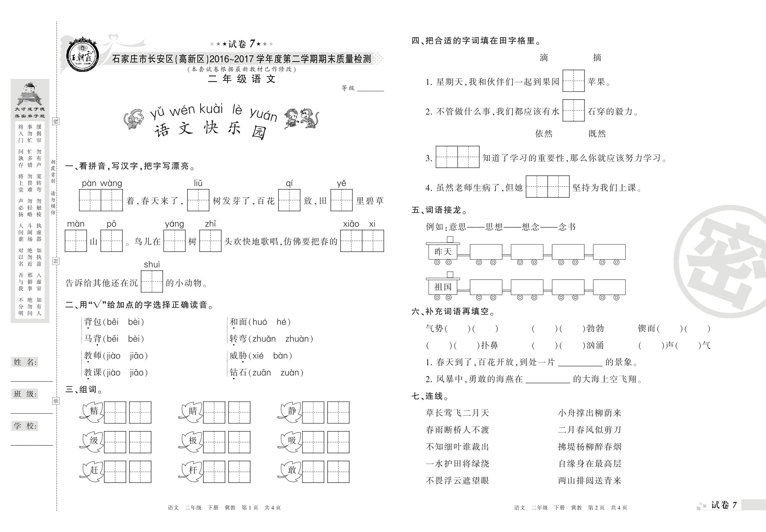 2016-2017学年第二学期石家庄市长安区(高新区)二年级语文试卷(冀教版)【7】