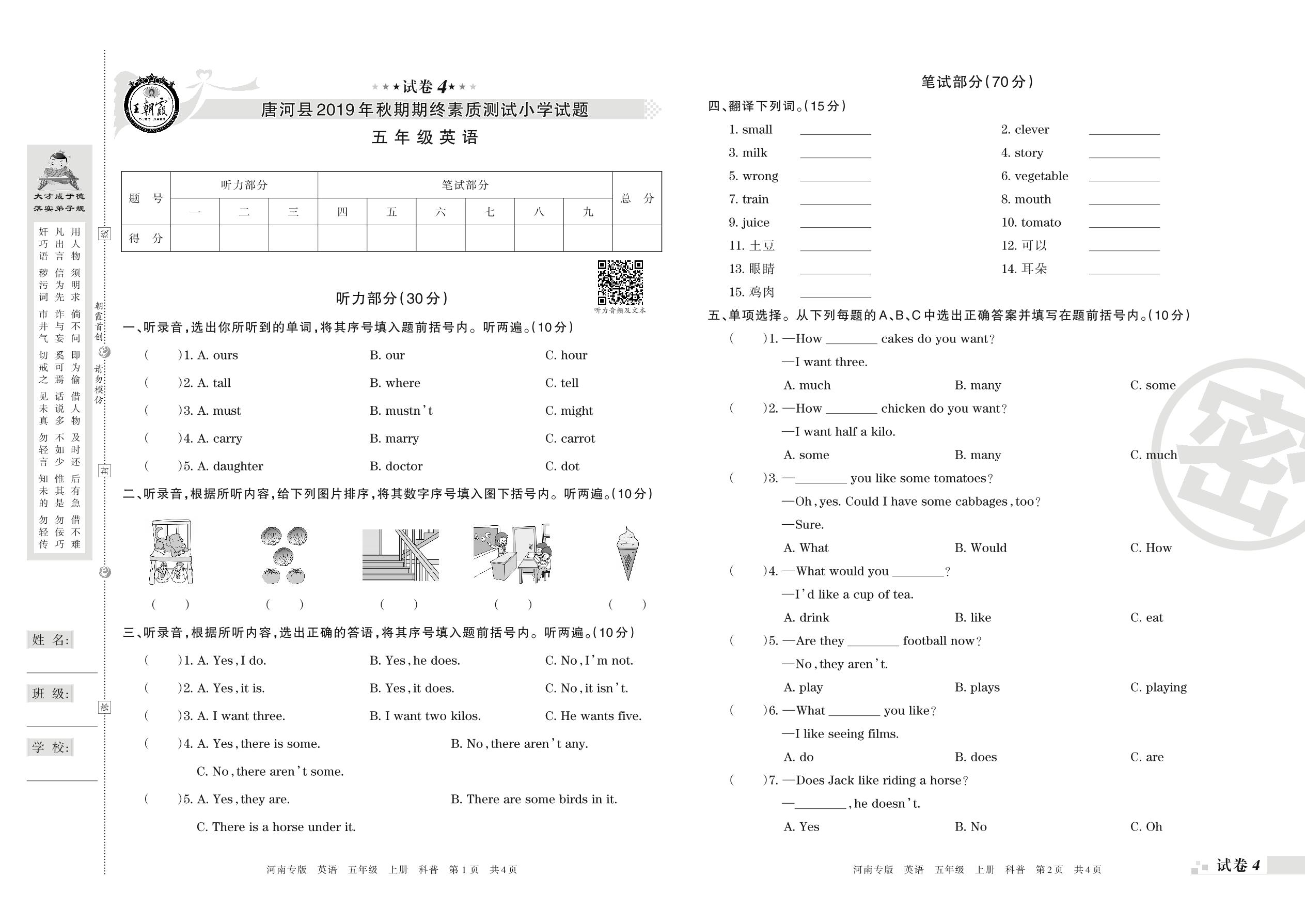 2019-2020学年第一学期南阳市唐河县五年级英语试卷(科普版)【4】